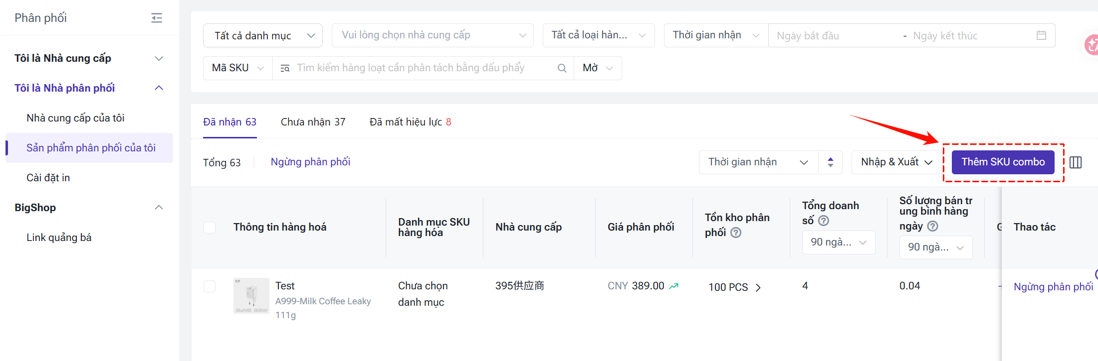 Tại danh sách Đã nhận, bạn có thể kết hợp các sản phẩm phân phối đã nhận thành các SKU combo.