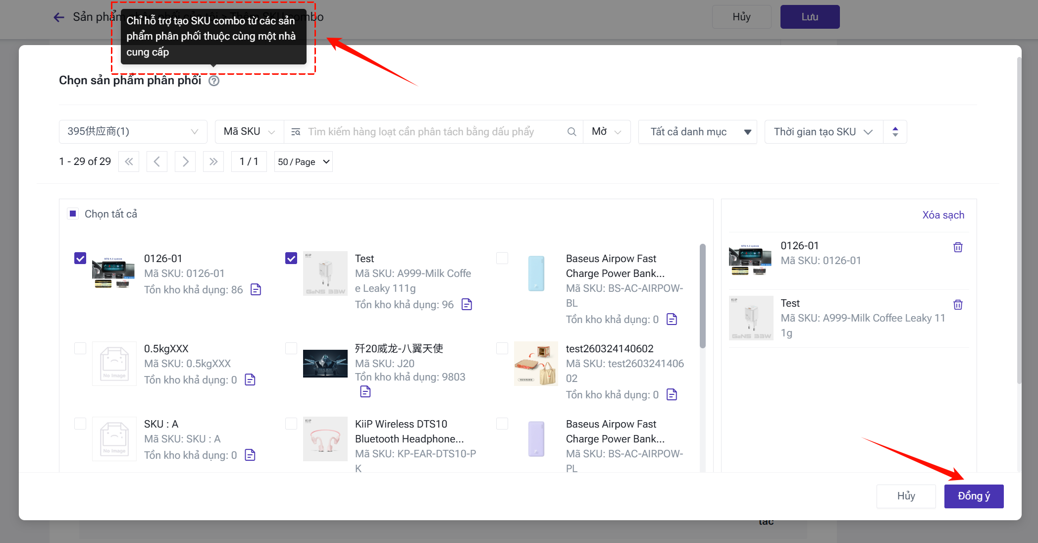 Bước 2: Chọn các sản phẩm phân phối từ cùng một nhà cung cấp để tạo thành SKU combo.