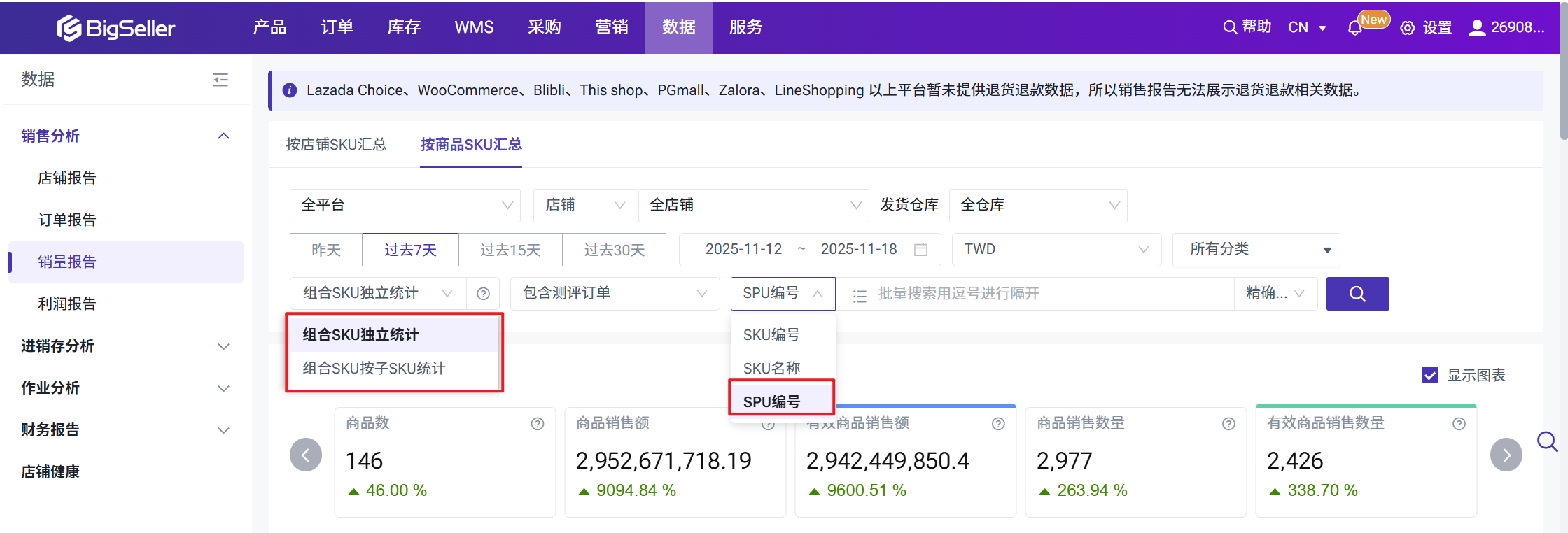 按店铺SKU汇总:在对多变种分析时,可先将数据汇总到SPU,再分析SKU。