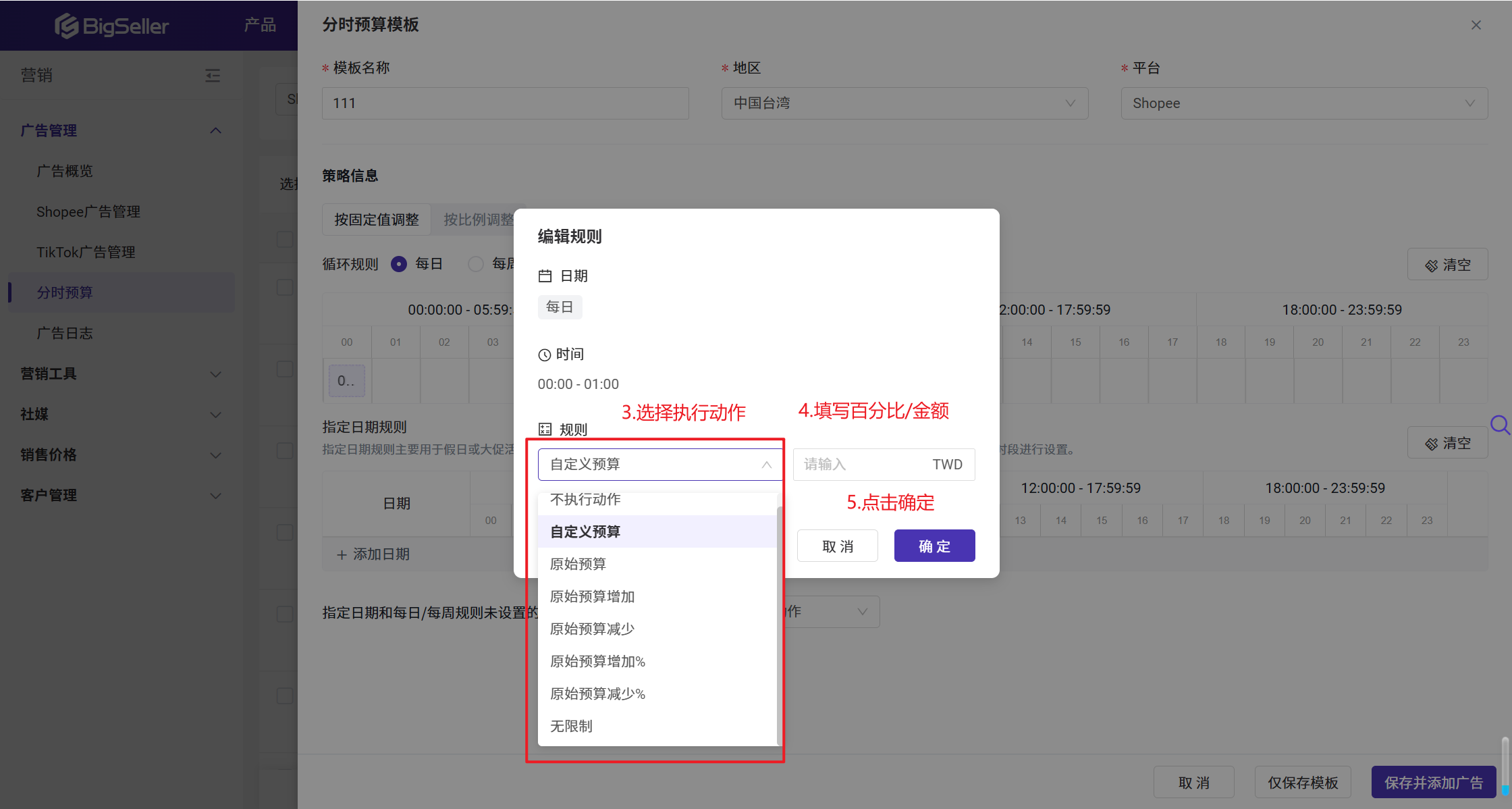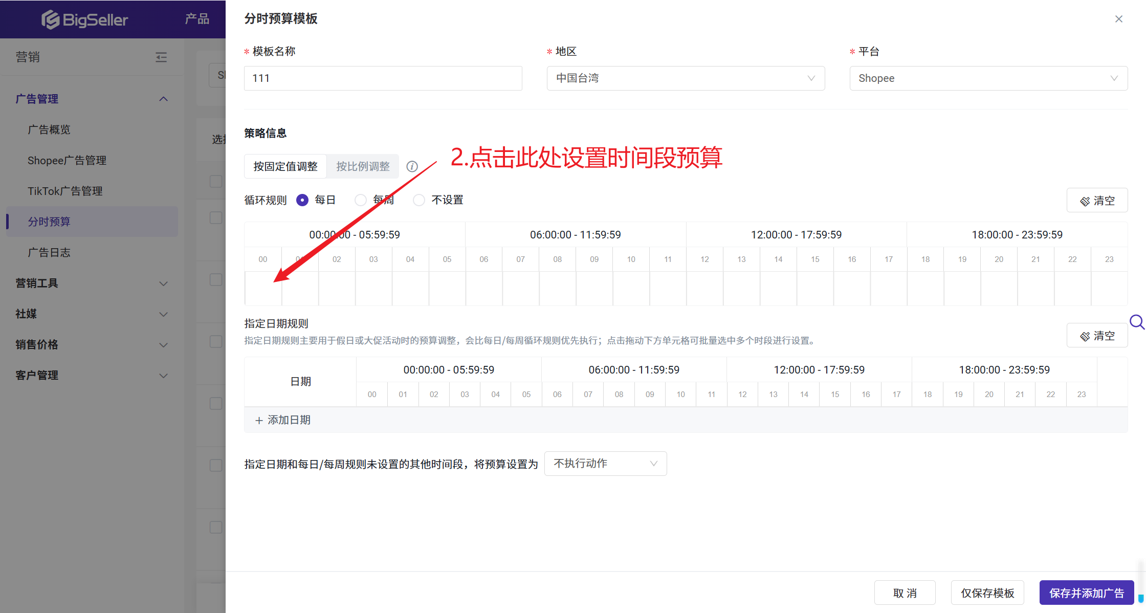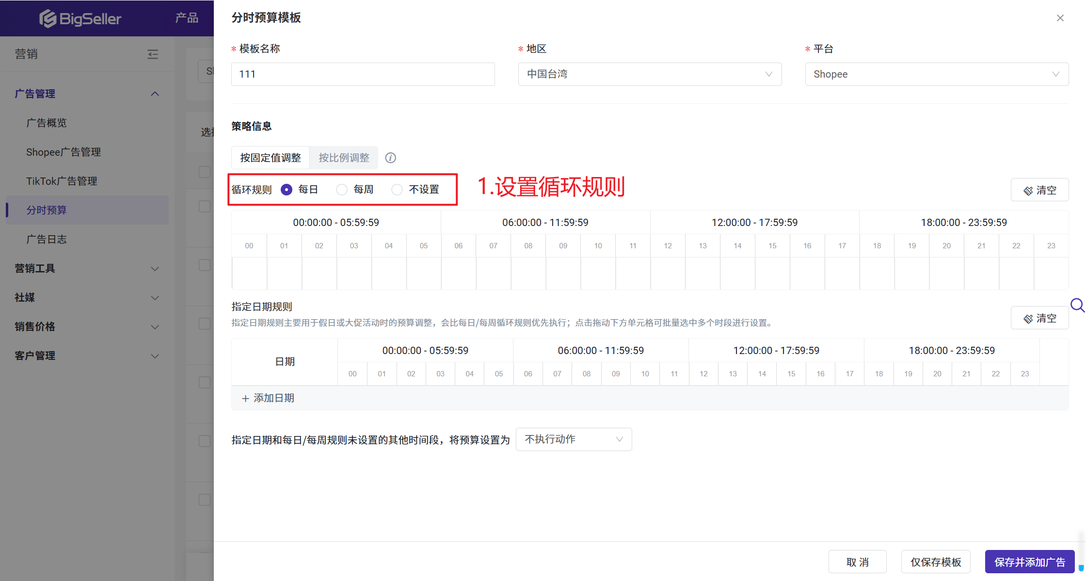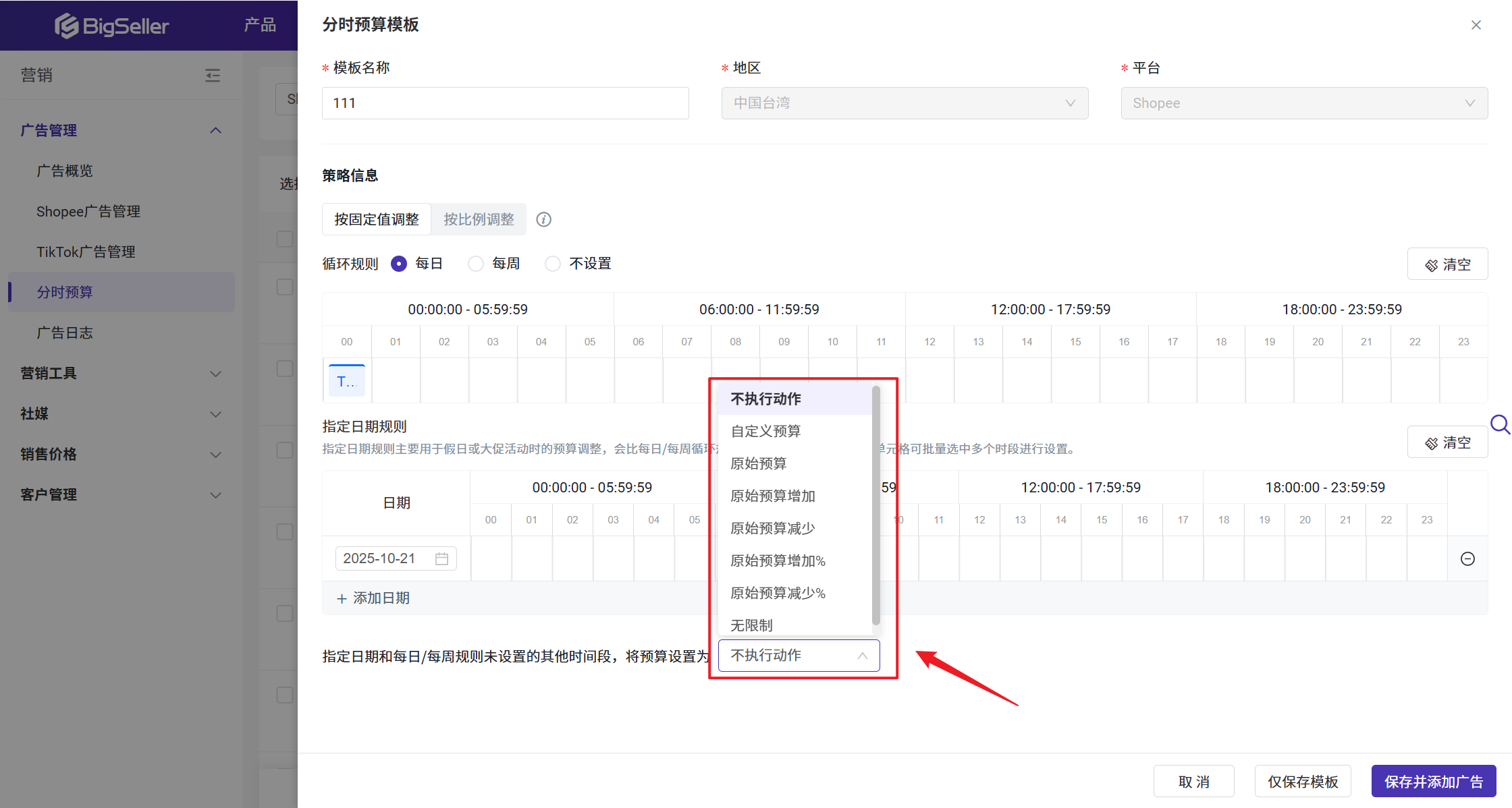 无限制:,系统在对应时间段将模板内「应用状态」为「开启」的广告的预算改为(无限制),仅支持Shopee