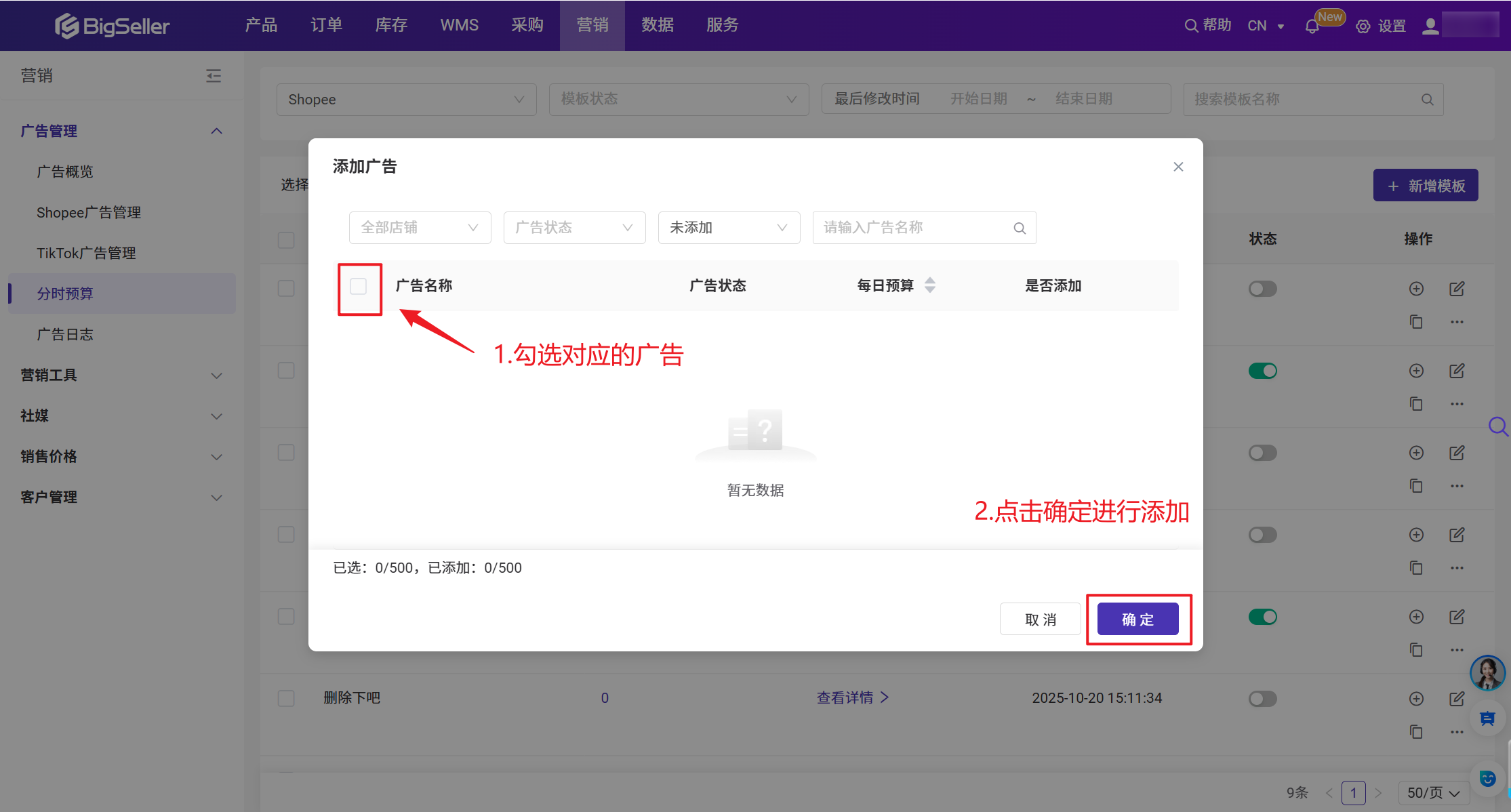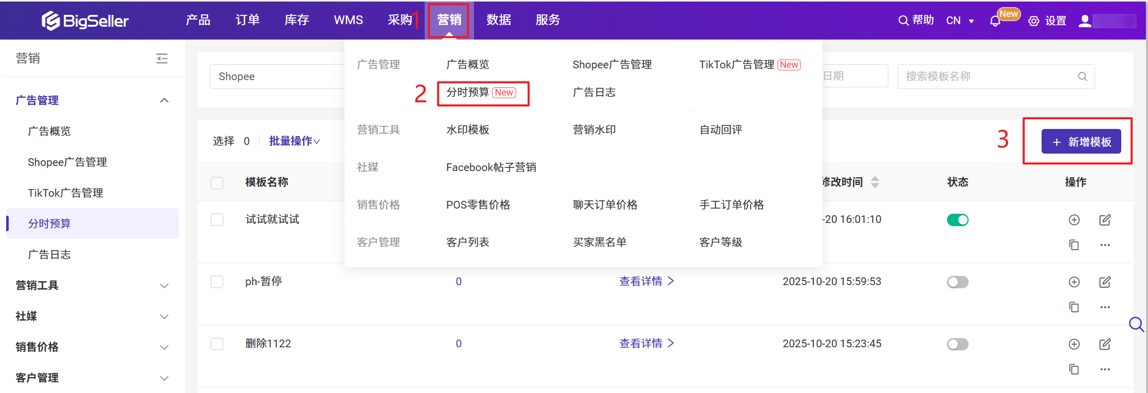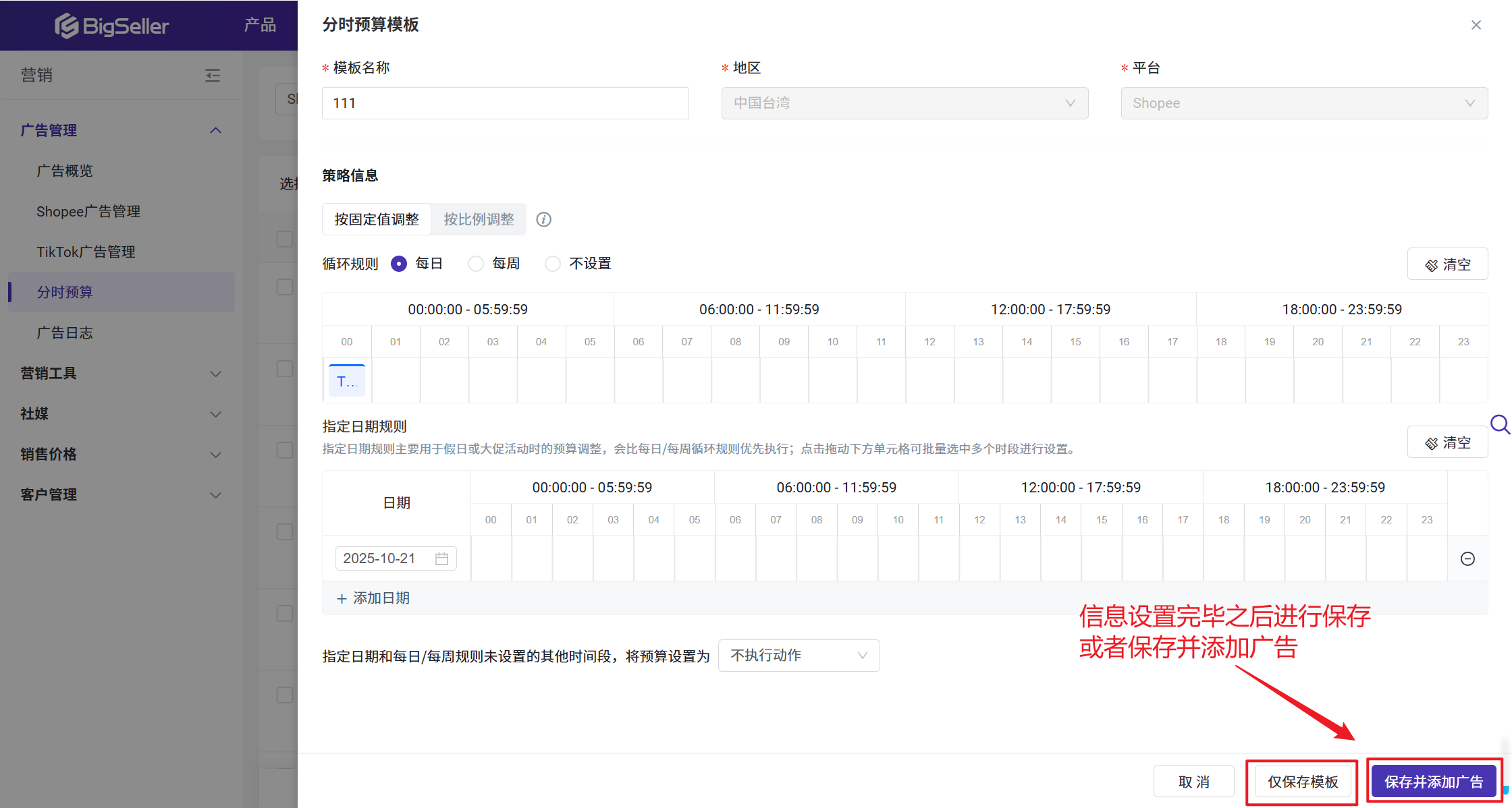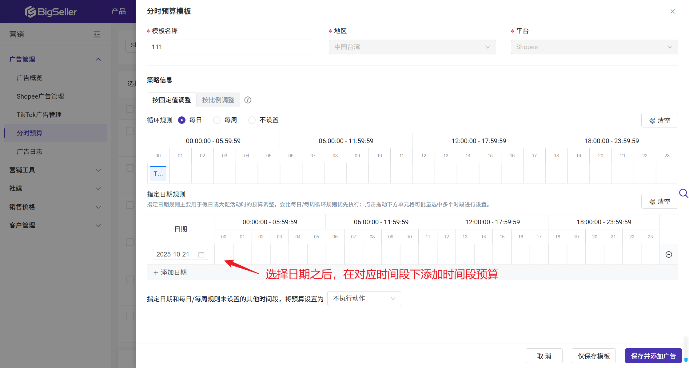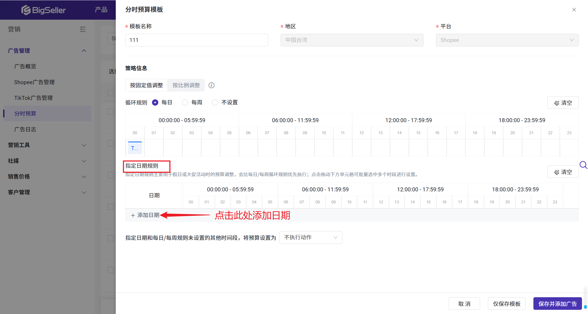 无限制:,系统在对应时间段将模板内「应用状态」为「开启」的广告的预算改为(无限制),仅支持Shopee