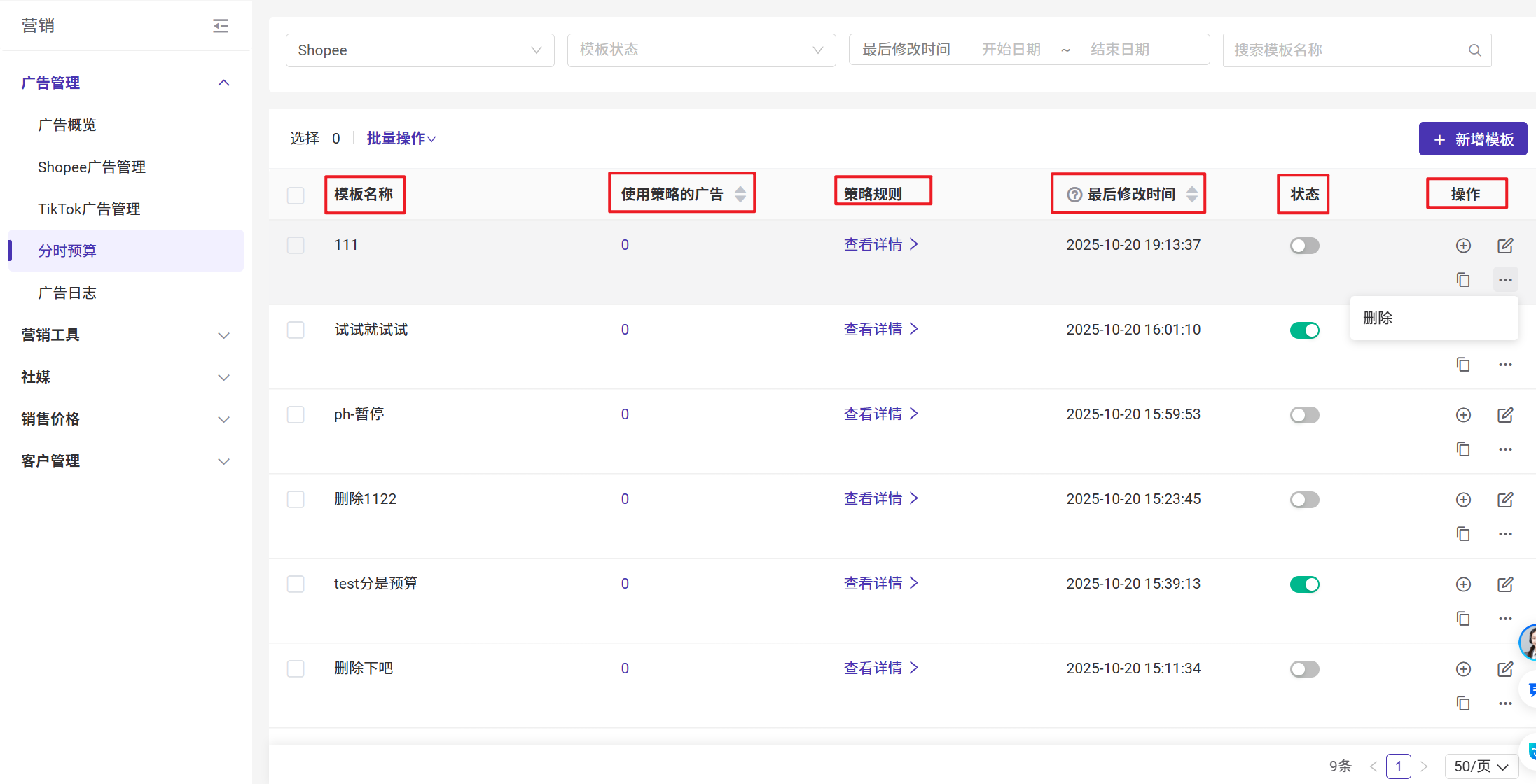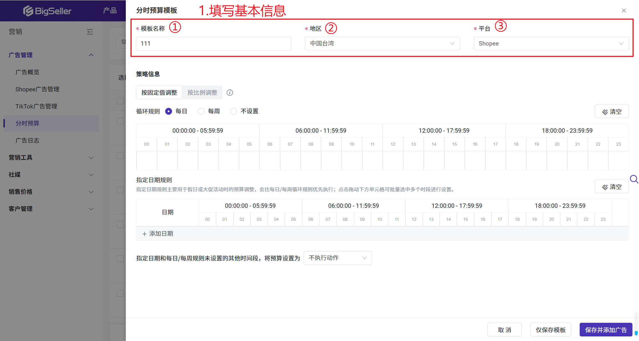 1、创建模板时,需选择应用的站点;选择站点后,Shopee平台只选择店铺站点与模板站点一致的广告,TikTok平台只选择广告账户站点与模板站点一致的广告2、分时预算模板策略信息中循环规则和指定日期规则至少设置其中一个