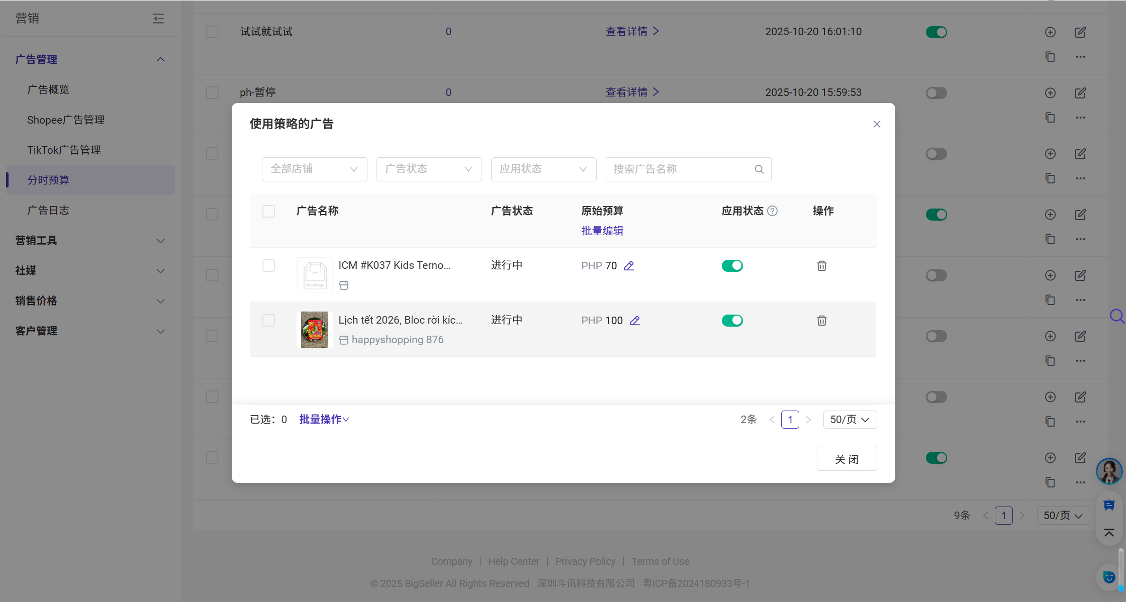 使用策略的广告:点击将展示添加到策略中的广告名称、广告状态,原始预算、应用状态,可操作删除