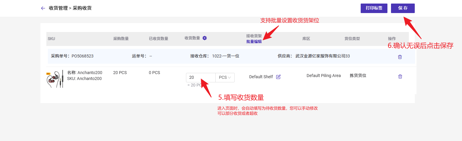 收货数量可以填写为0,则表示不收/不处理,后续可以在部分收货位置再进行收货
