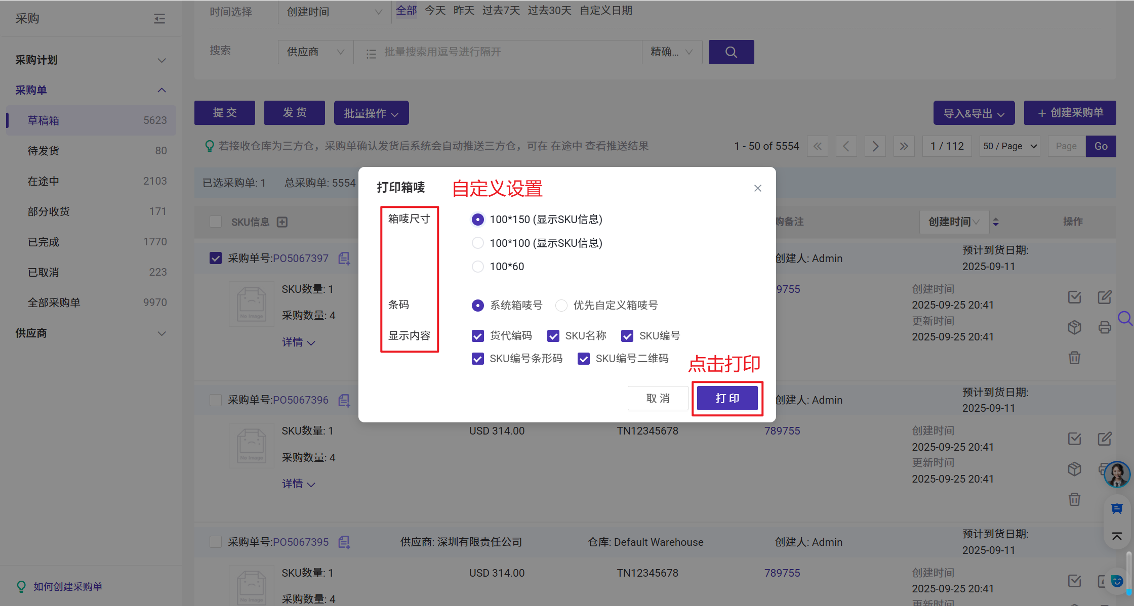 在采购 草稿箱/待发货/在途中/部分收货/已完成,您都可以打印箱唛选择采购单 > 点击打印图片 > 点击打印箱唛