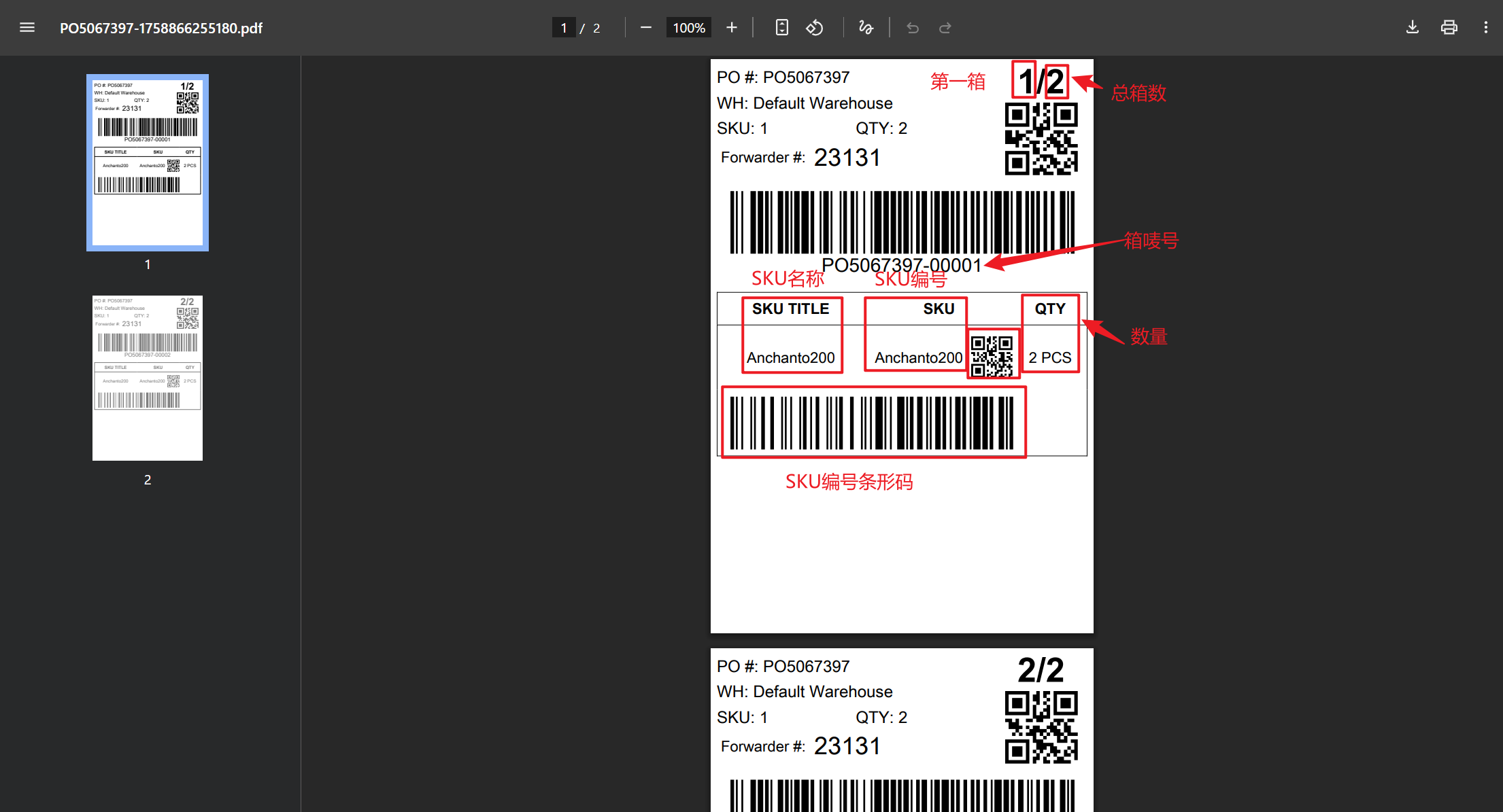 系统箱唛号:箱唛编号是使用采购订单编号和包装箱序列号生成的。(例如:PO7084801-00001)