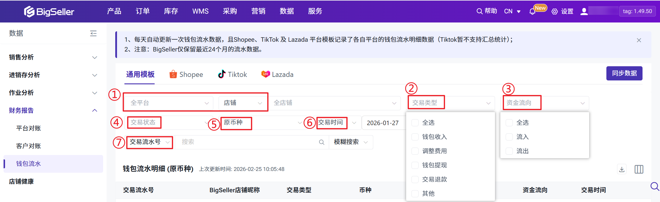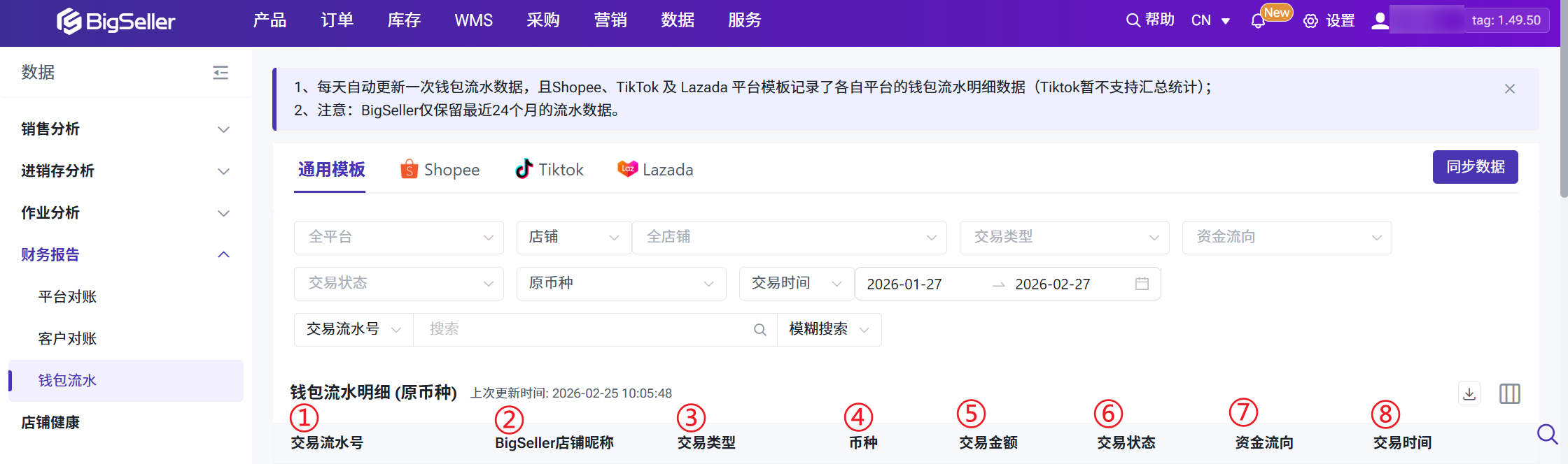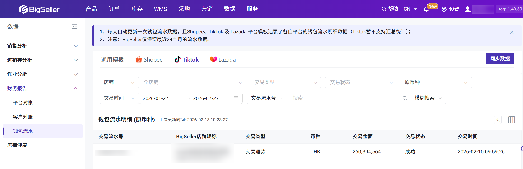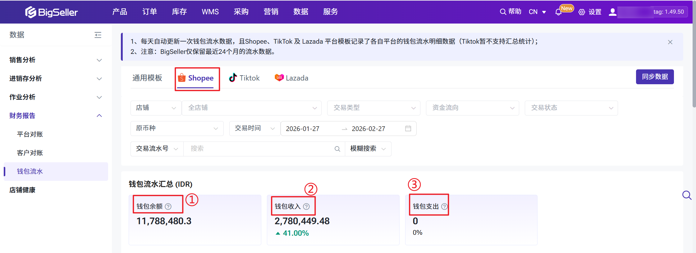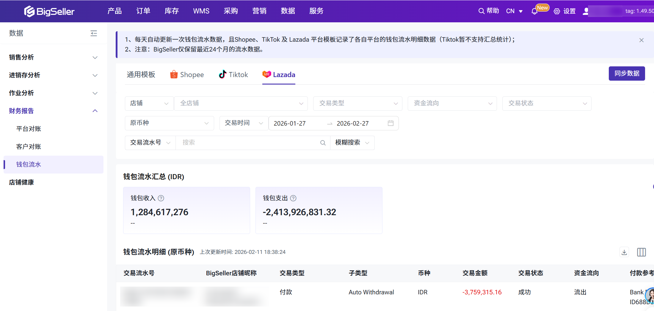 目前接入Shopee、TikTok、Lazada三大平台的钱包流水,记录三大平台的钱包流水明细数据为卖家提供 跨平台/跨店铺的“财务看板”。