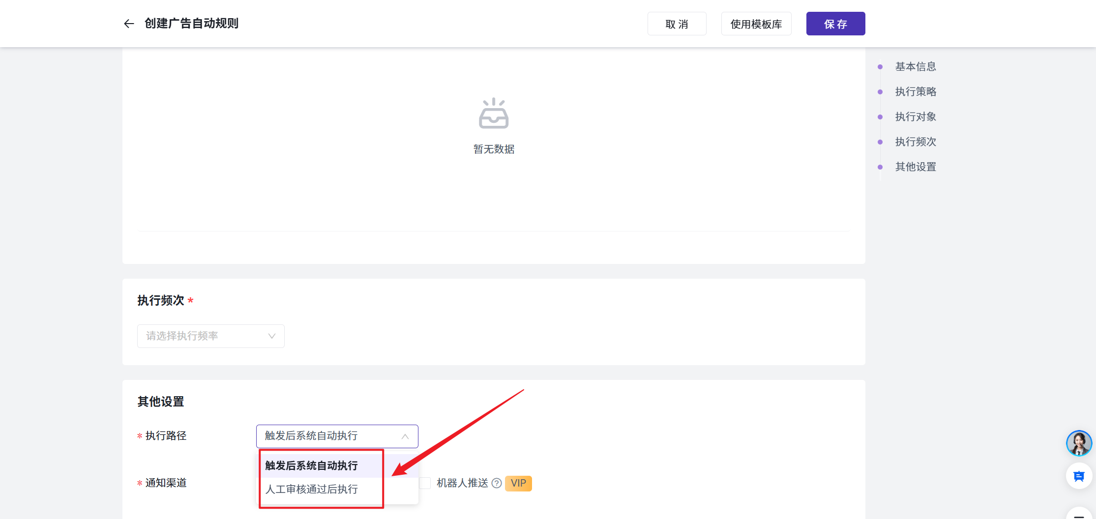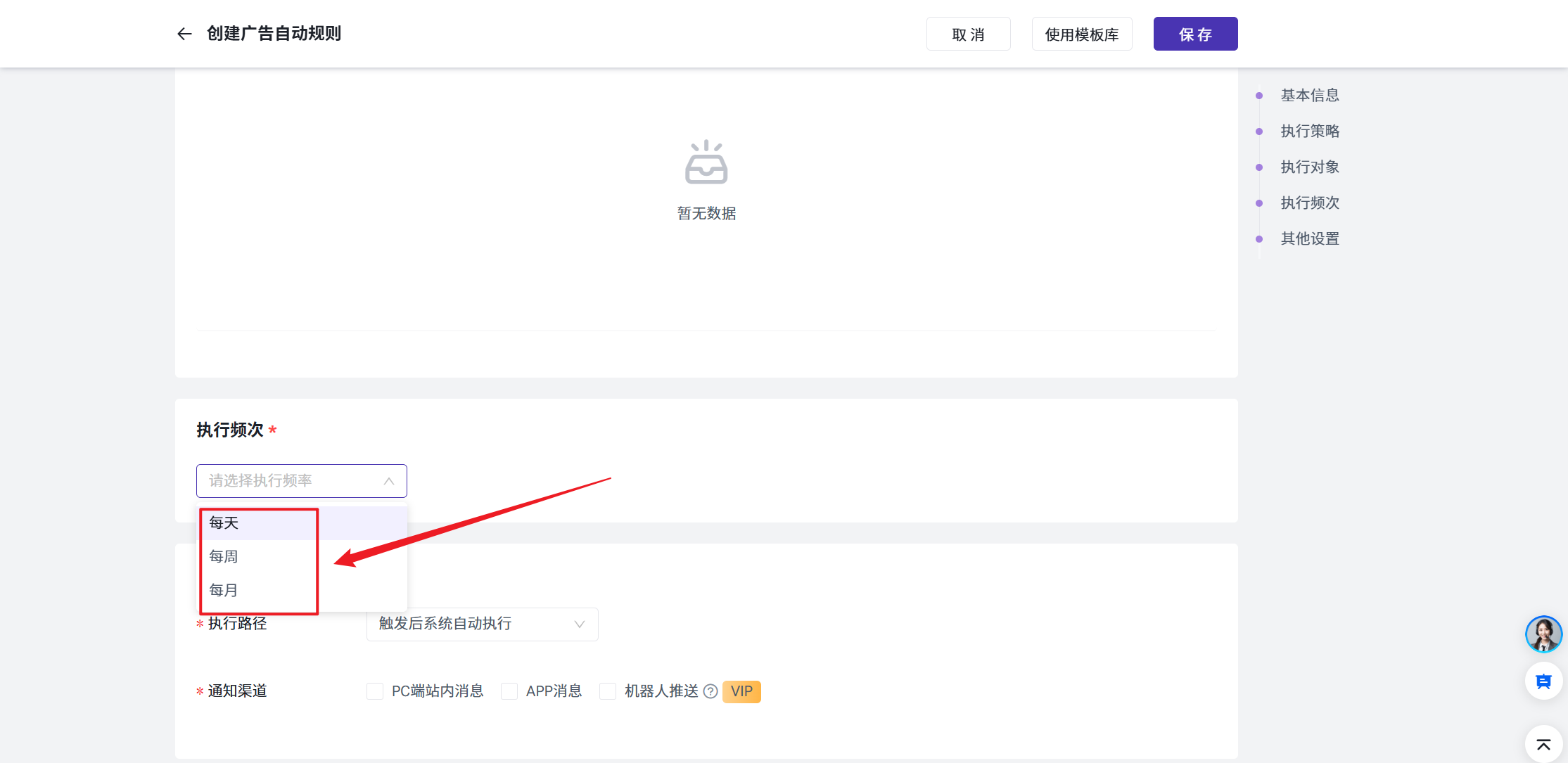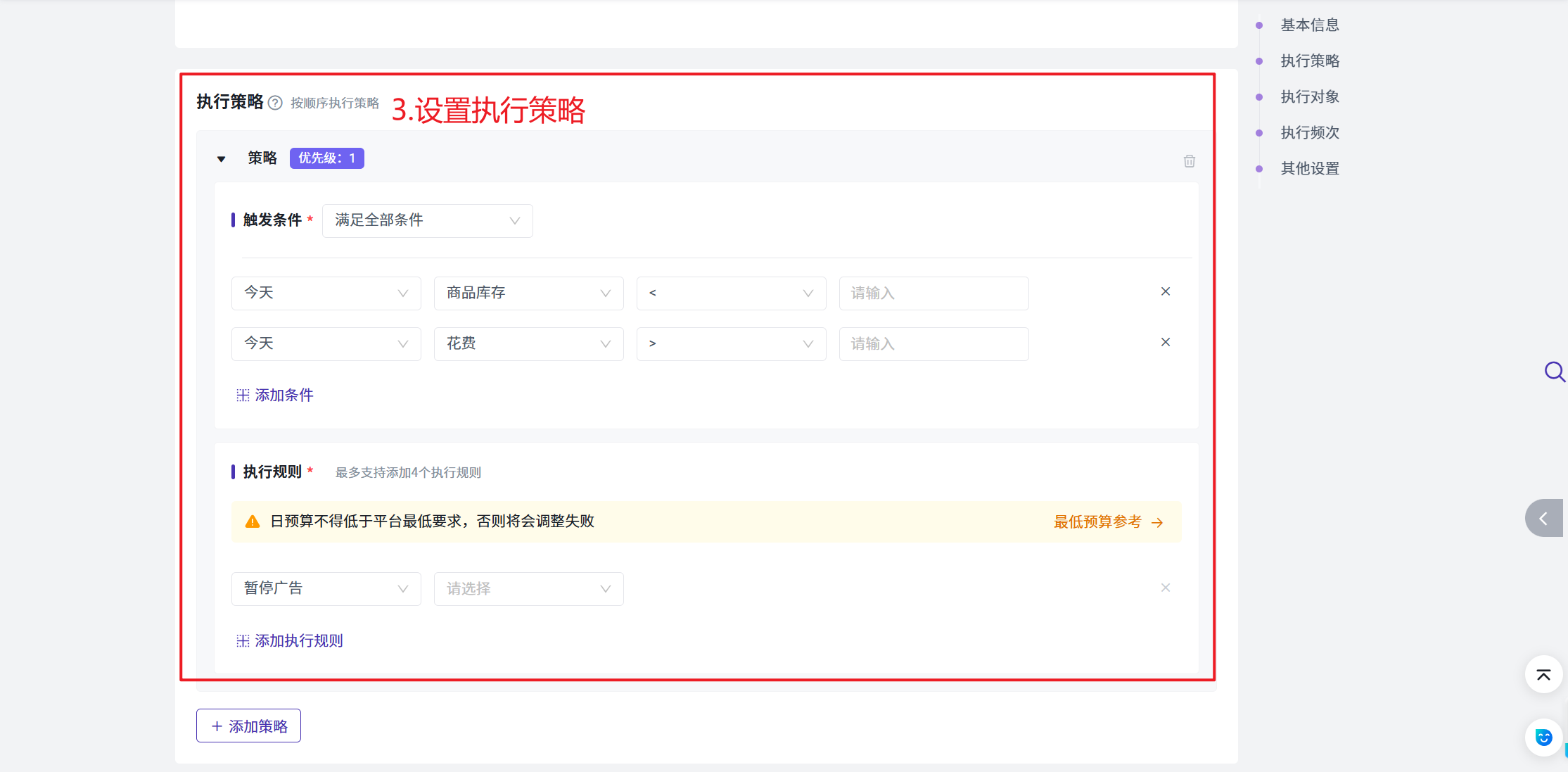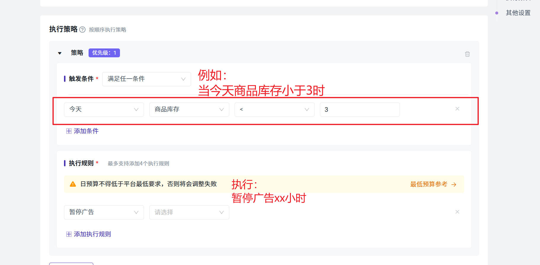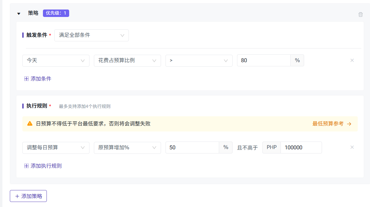 条件设置:可以设置以花费/ROAS/花费占预算比例/转化等为指标,根据实际需求设置