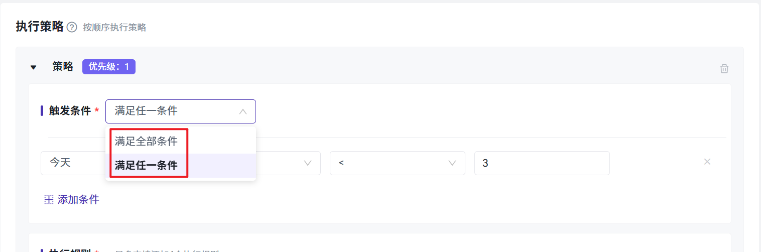 执行策略可以设置多个,若多个策略都满足触发条件,则只执行优先级高的策略