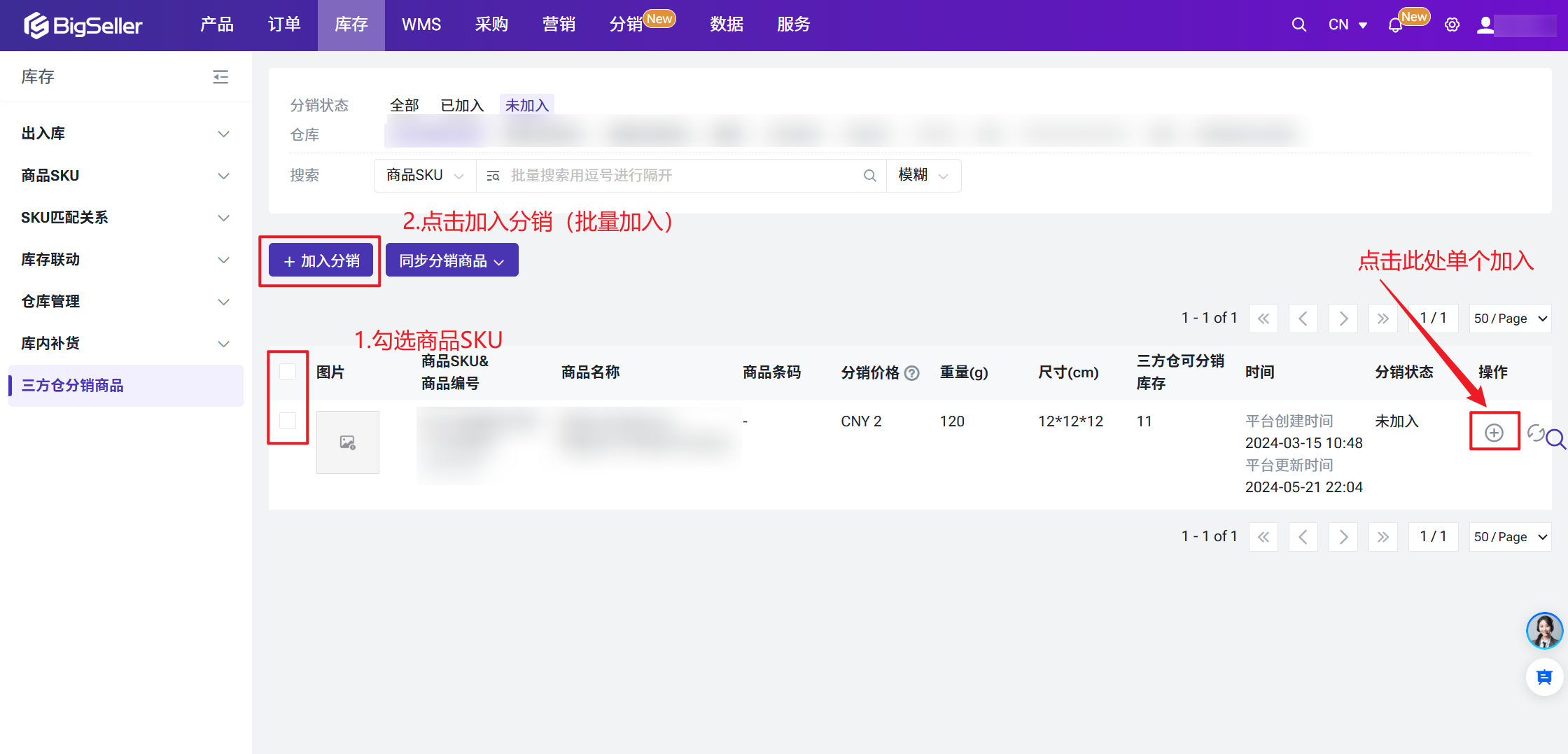 5、若在商品SKU页面、成功删除此分销商品、则分销商品列表页、对应仓库的三方仓、分销商品的状态会变更为“未加入”。