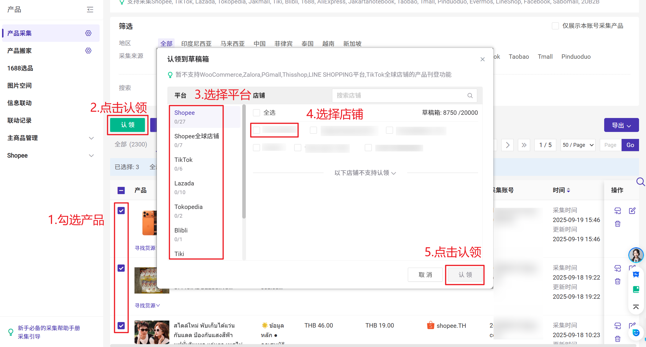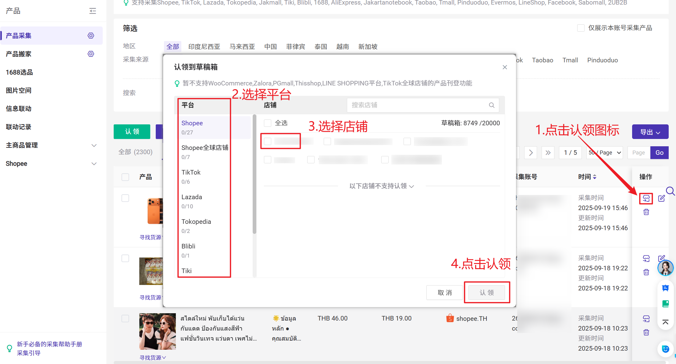 进入采集列表,勾选产品 > 点击 认领 > 选择平台 > 选择店铺