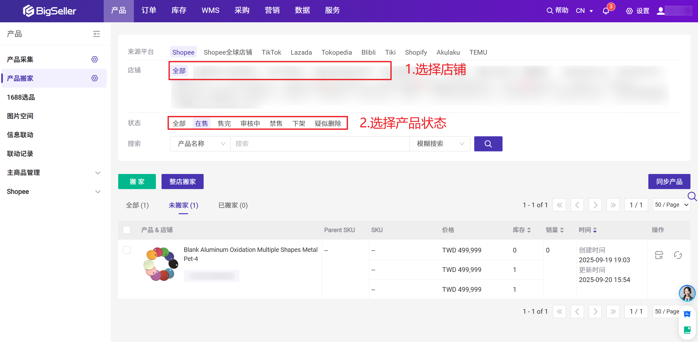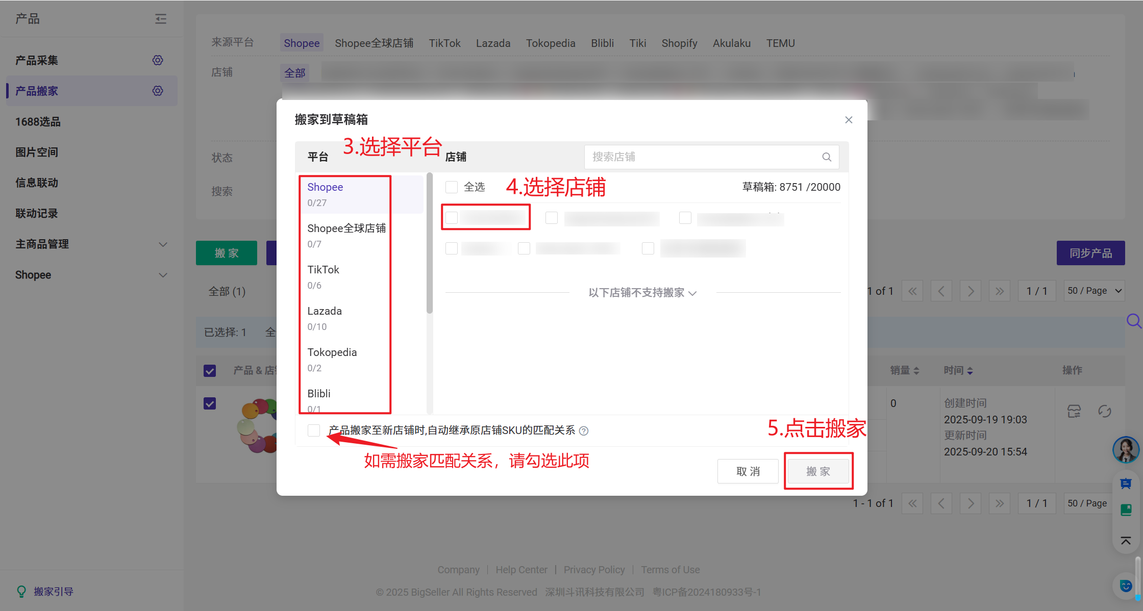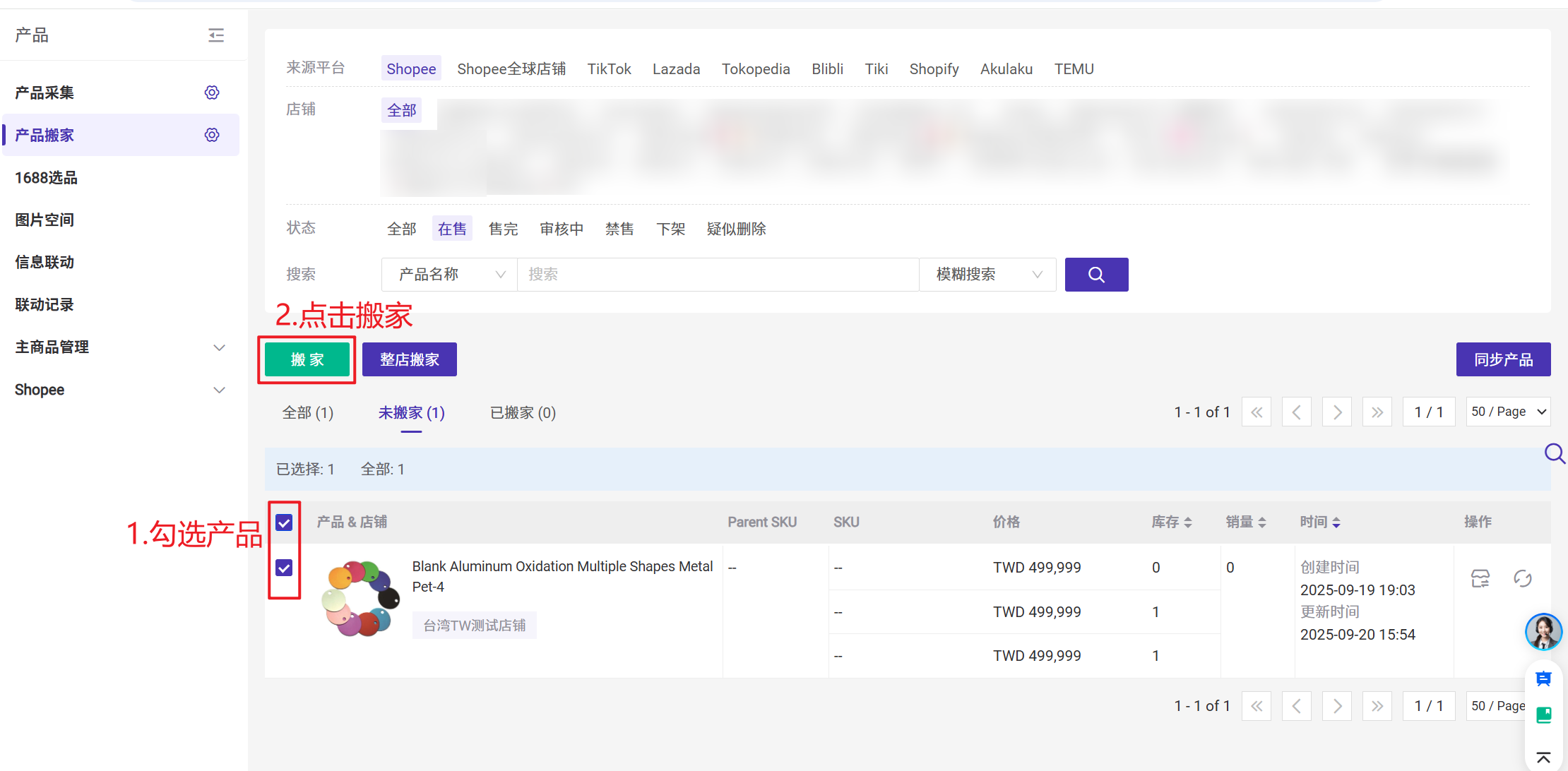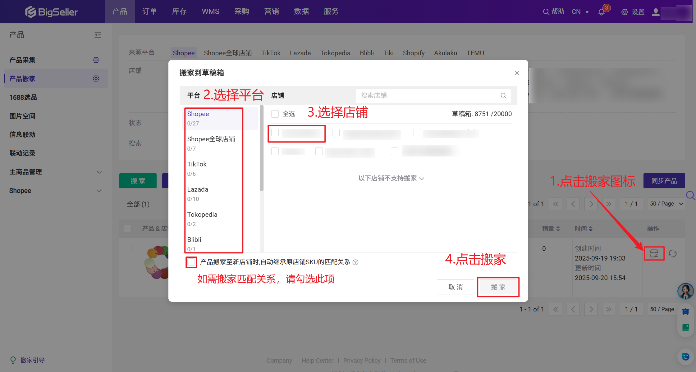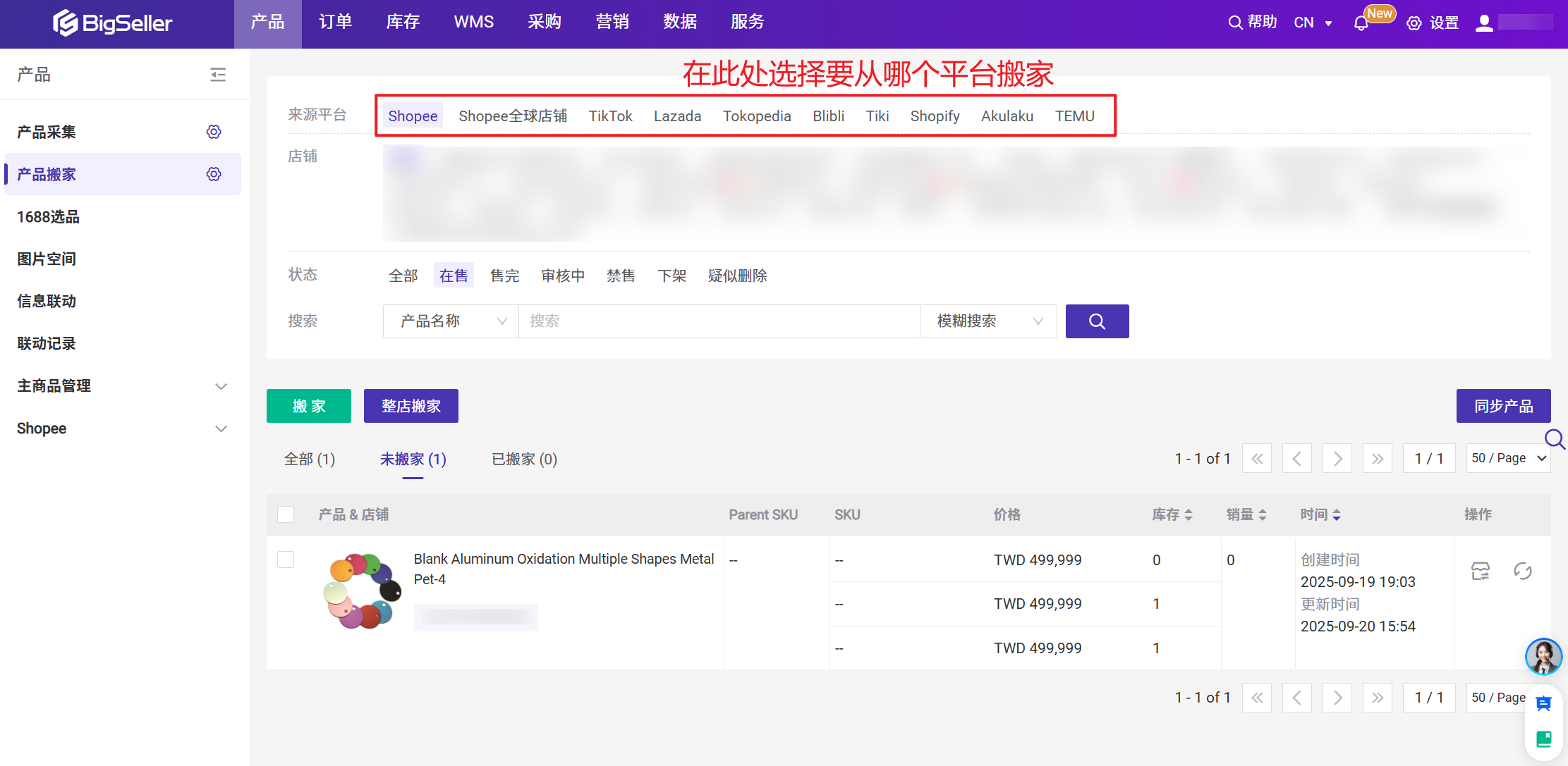 勾选产品 > 点击 搬家 > 选择目标平台 > 选择目标店铺