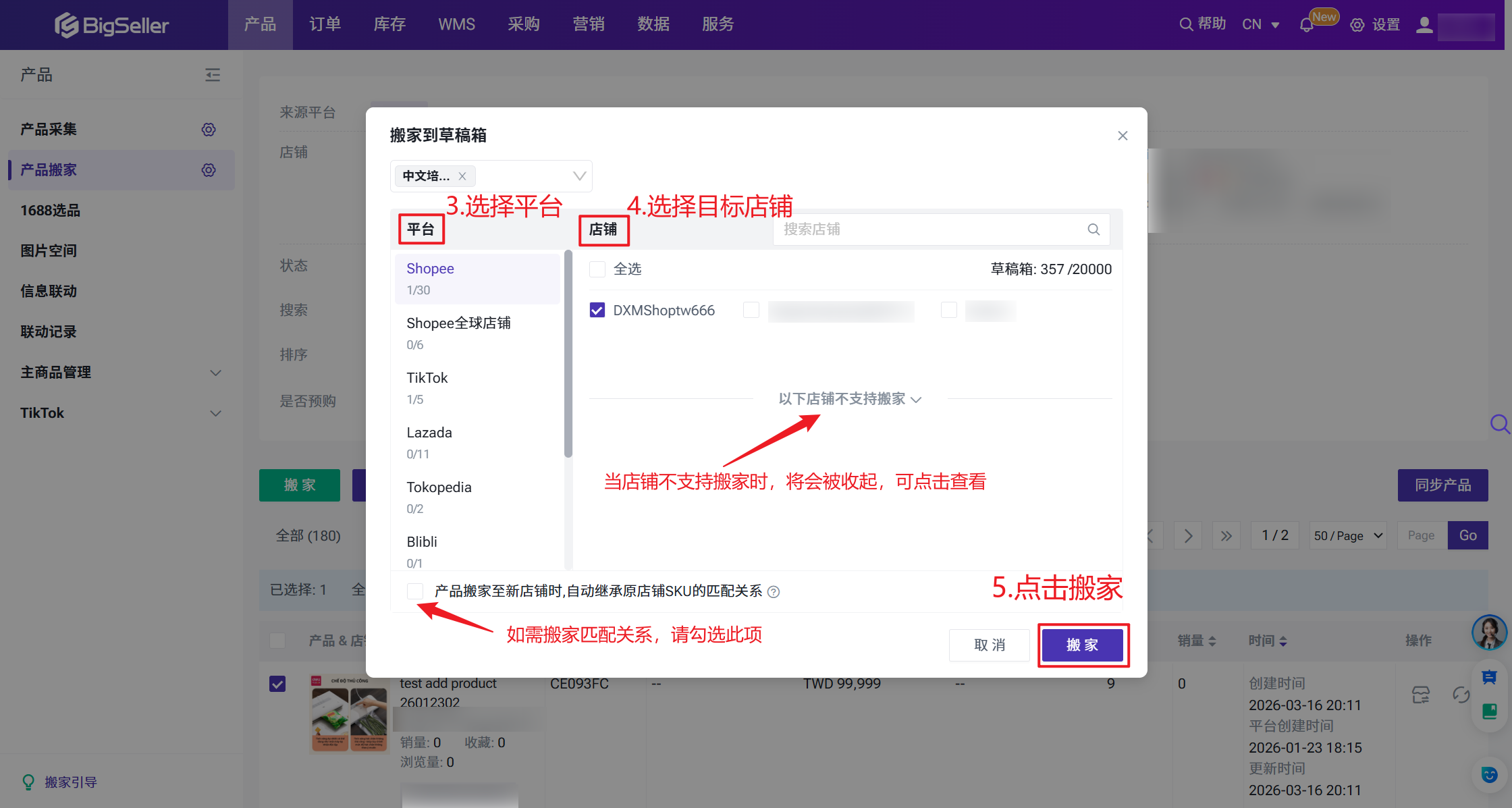 第二步:选择源店铺和想要搬家的产品的状态 > 选择目标平台和店铺 > 选择是否跳过重复产品 > 选择是否搬家匹配关系 > 确认信息无误后点击确定