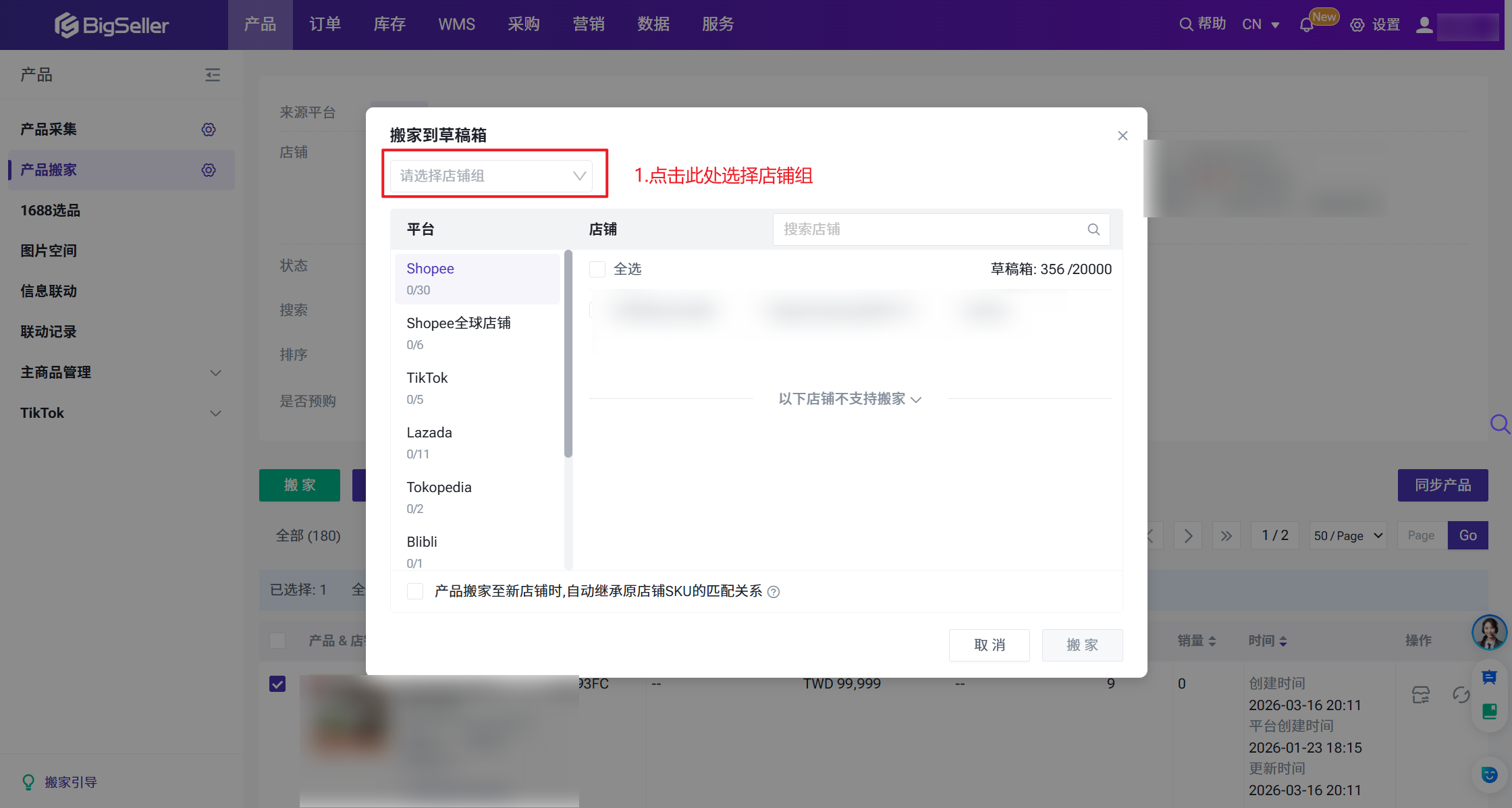 * 搬家产品后,您需要进入草稿箱完成产品编辑和刊登,产品才能成功刊登到店铺
