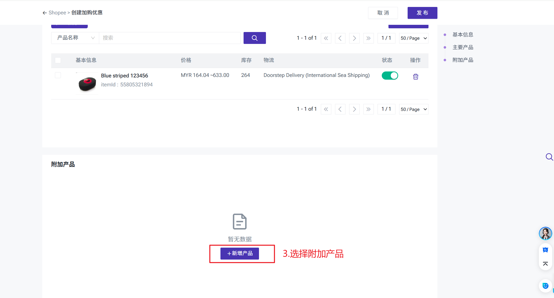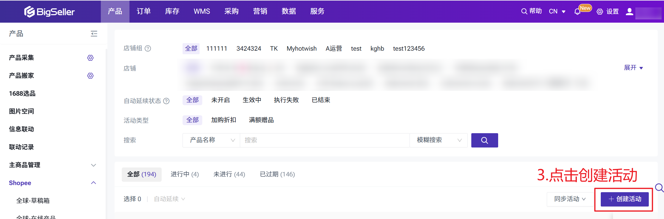 第一步:进入加购优惠页面产品 > Shopee > 加购优惠 >点击创建活动