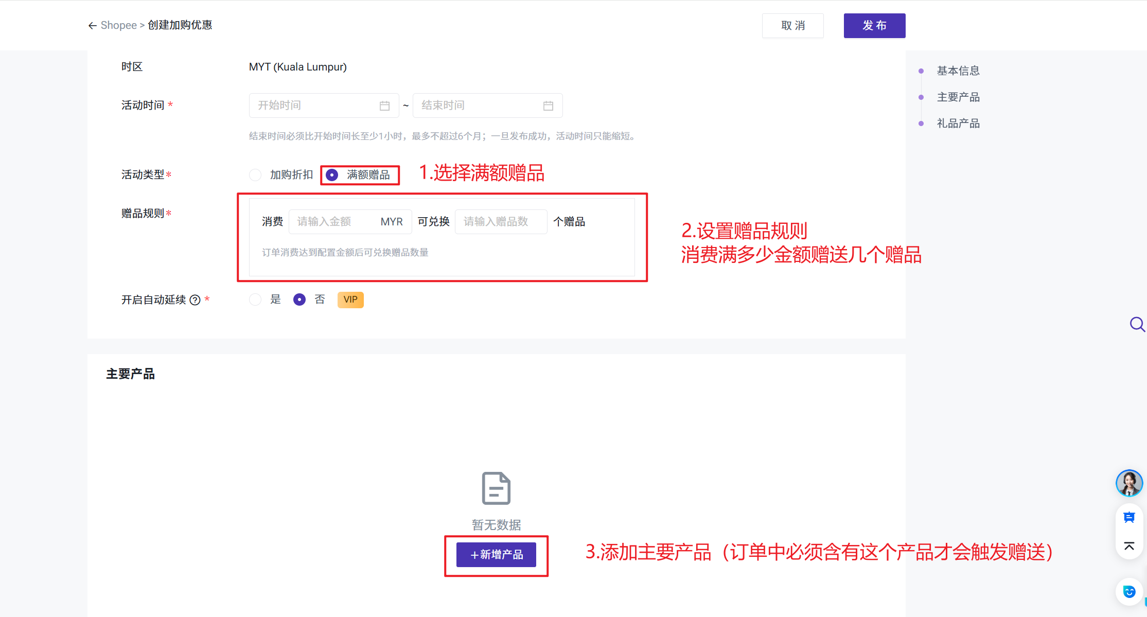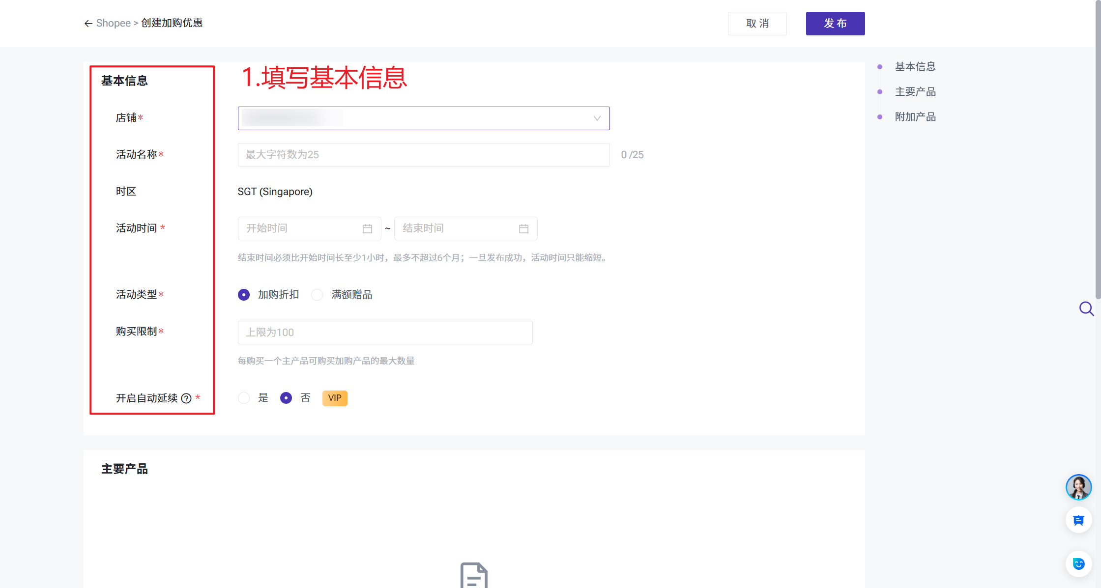 发布活动时,至少要添加并开启一个主要商品