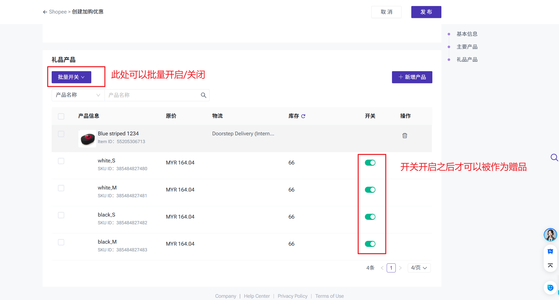例如,礼品产品的变种开启了5个,那么赠品规则可赠送的赠品最多5个,不能高于礼品产品开启的变种数量
