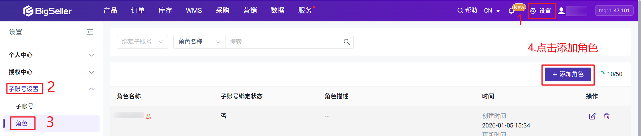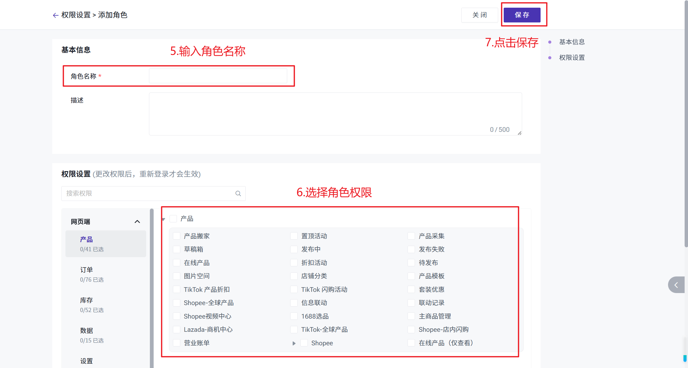 第一步:创建角色(例如运营人员、仓库人员、财务人员等)