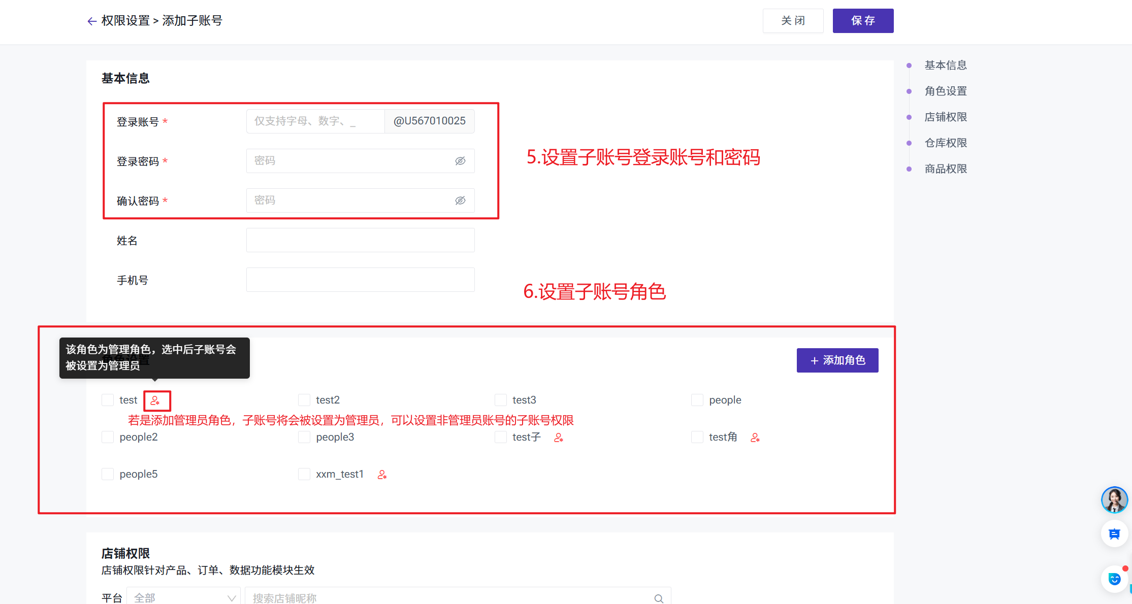 新增【管理员】账号,管理员可以对自己创建的子账号,或者主账号移交的子账号进行管理,但只能赋予管理员自己账号具备的店铺范围权限