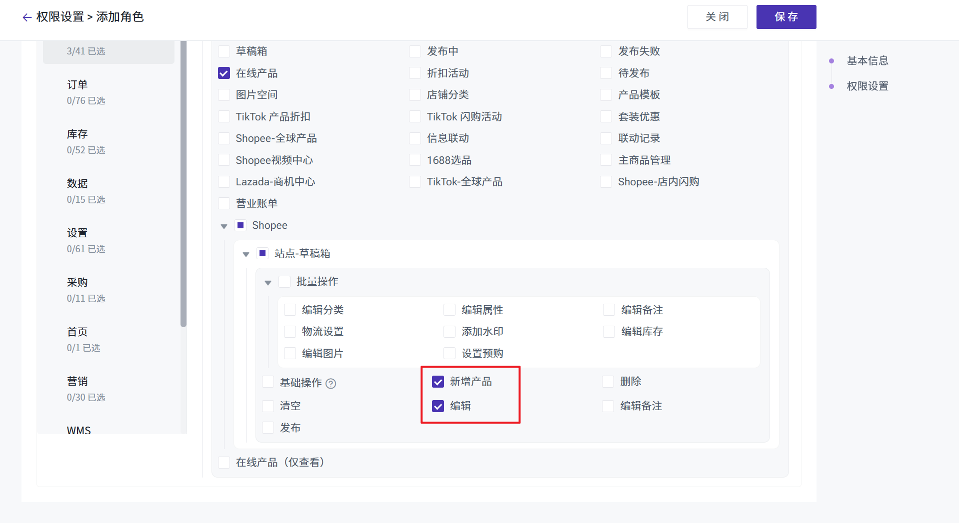 例如,当管理员角色,仅有Shopee站点新增产品及编辑权限时,对下属子账号,也仅可以赋予这两个权限,不可以进行发布或删除等无权限操作,也不能将这些权限赋予子账号