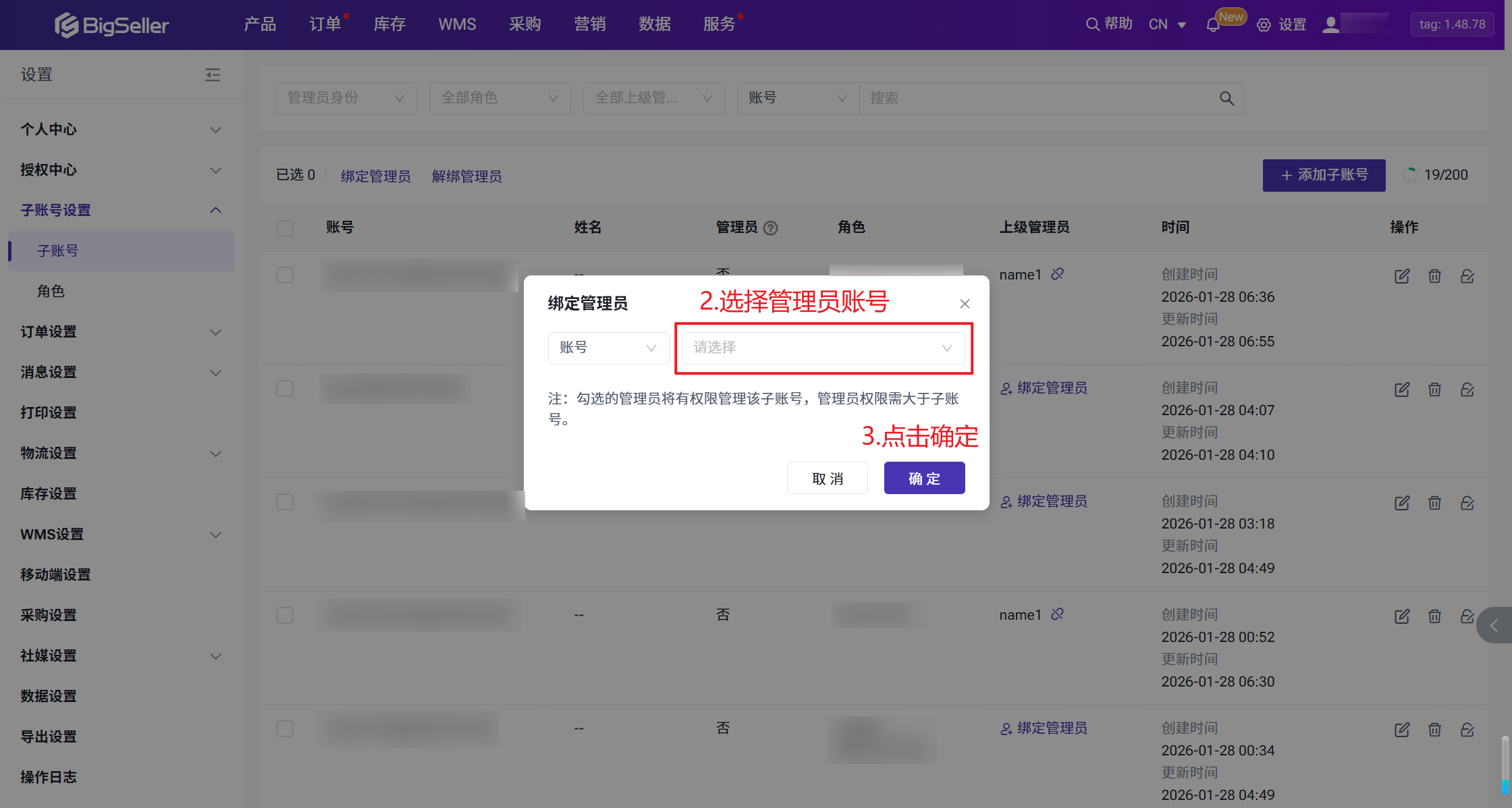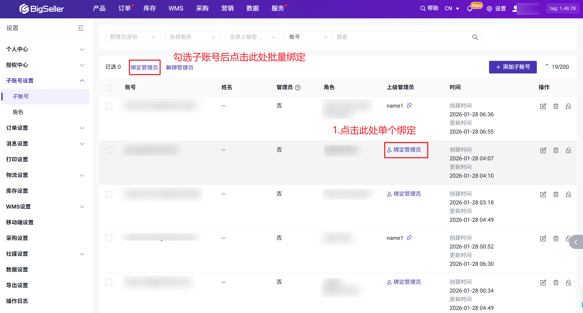 当您创建好子账号之后,您可以将子账号绑定到对应管理员账号下,由管理员进行管理