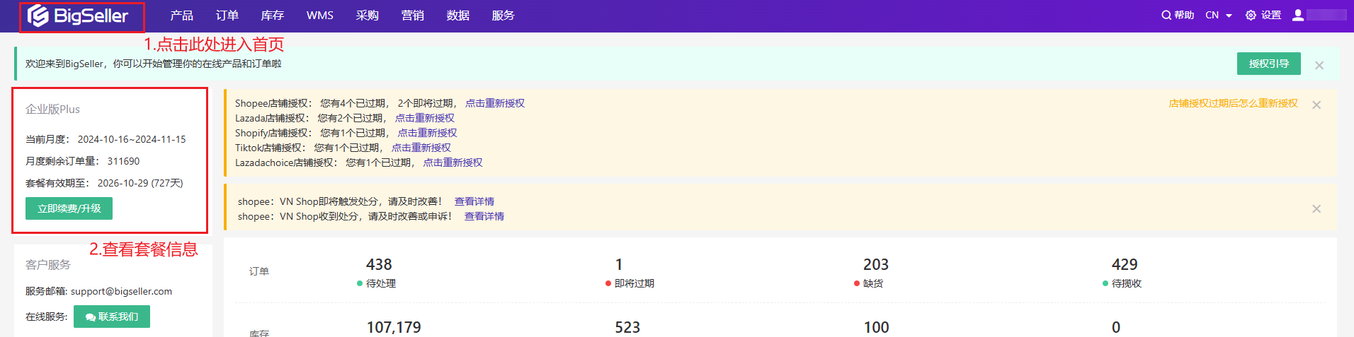 1. BigSeller VIP购买后会将时长直接发放在登录的BigSeller账号内,进行时长累加。您可以在BigSeller首页查看VIP套餐的具体市场,或者在“设置>个人中心>我的订阅>购买记录”里查看订阅记录。