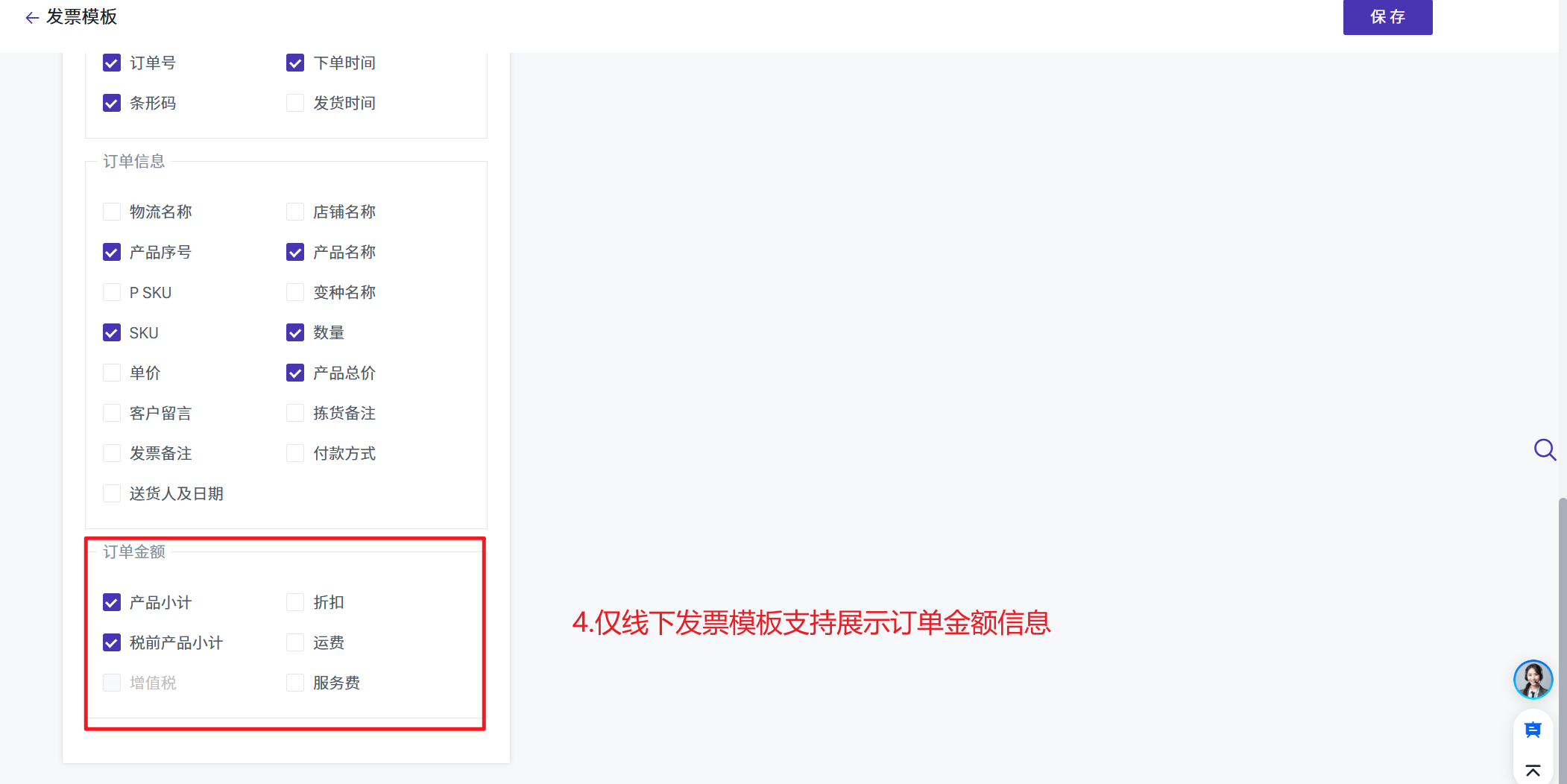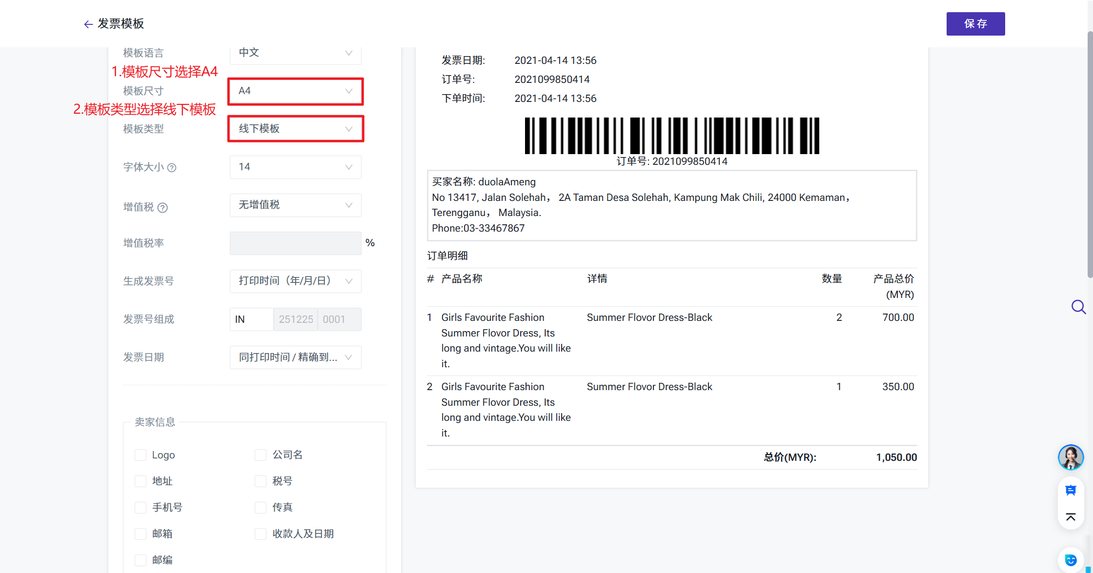 当选择A4尺寸时,可以选择线下模板,订单金额模块支持自定义