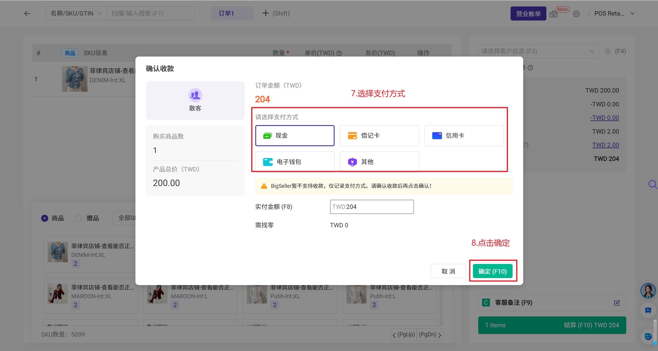 第二步:创建好订单后点击结算 > 选择支付方式 > 点击确定