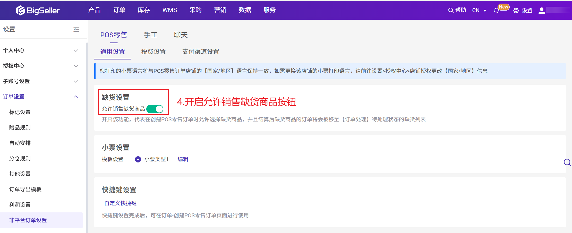 4、在店铺授权-其他-POS零售订单店铺可以查看店铺关联仓库