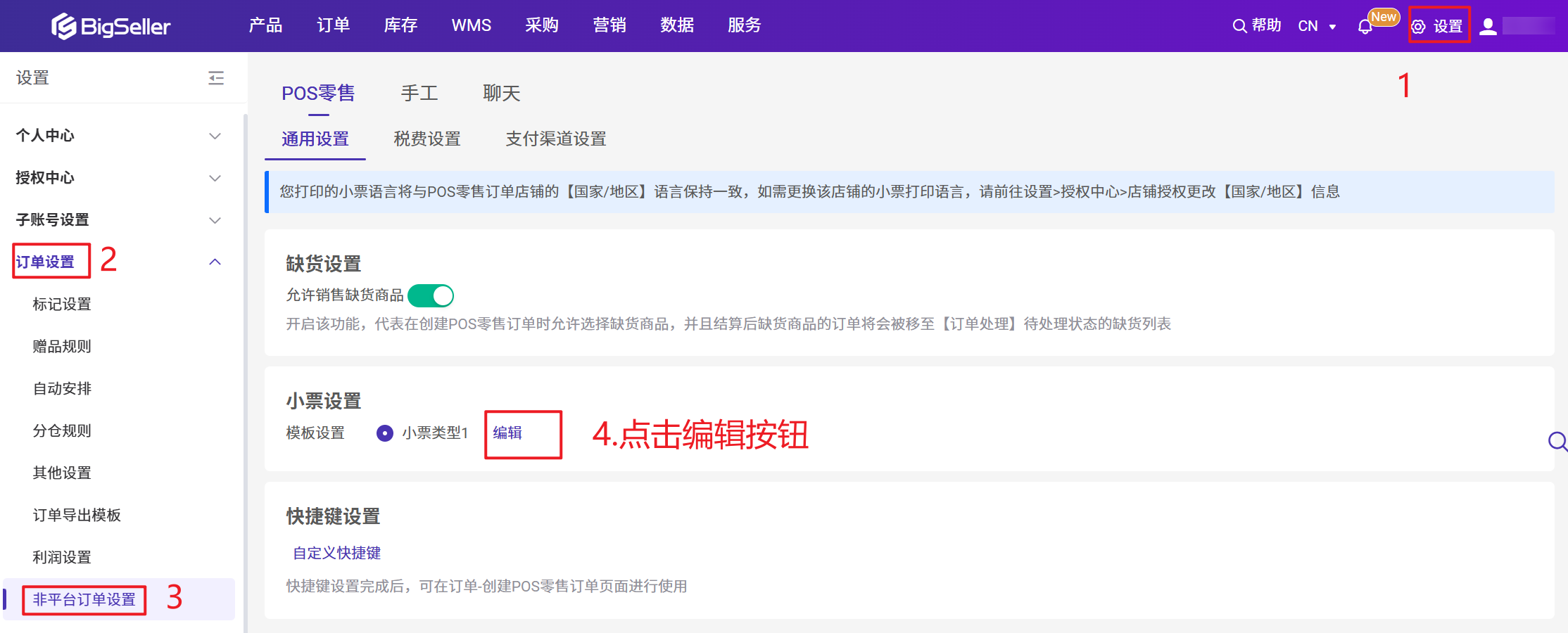第一步:点击设置 > 订单设置 > POS零售设置 > 自定义快捷键