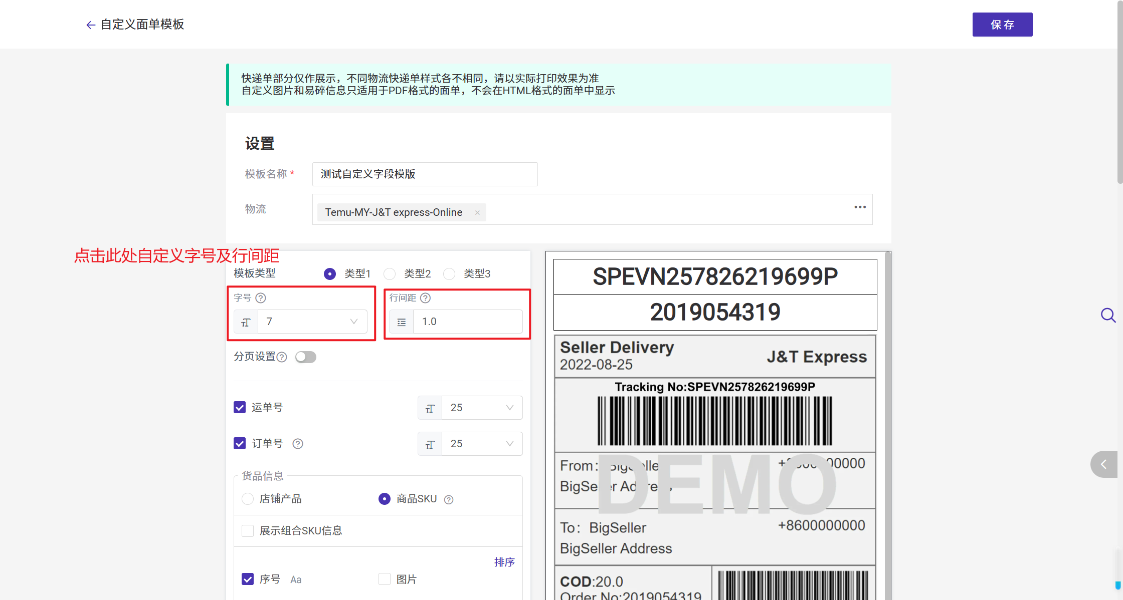 ③ 自定义面单字体大小支持6-25号(仅影响货品信息和备注的字体,不影响快递单的字体。但若货品信息列过多且字体大小超过20,可能会出现排版错乱的情况,建议选用适合的字体大小。)