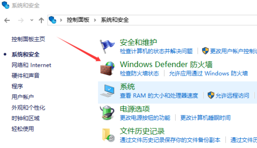 第三步:点击Windows Defender 防火墙