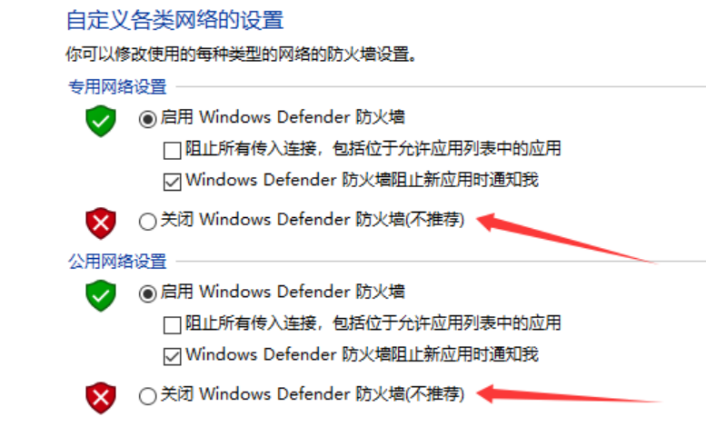 第四步:在新窗口中选择启用或关闭Windows Defender防火墙 > 选择关闭