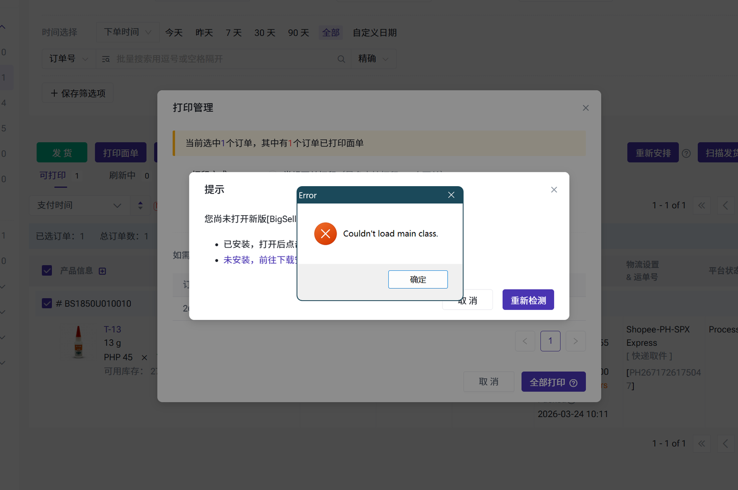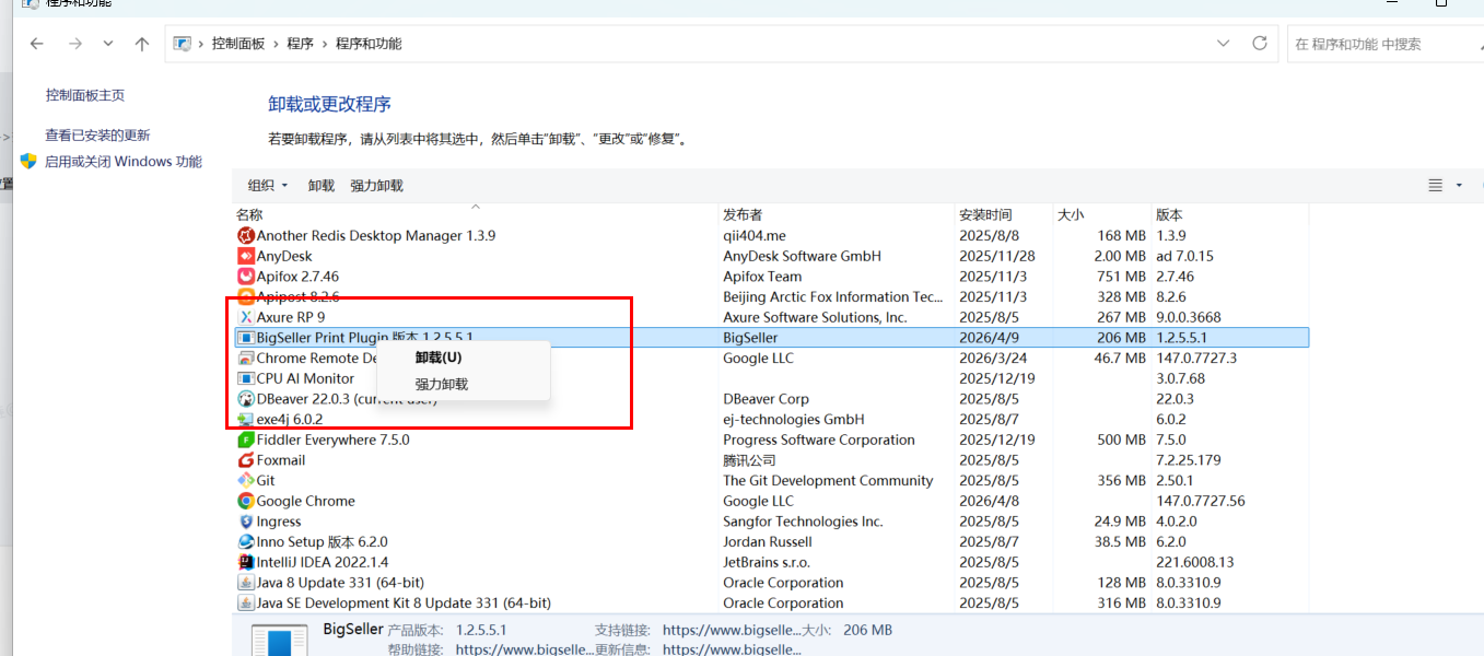 找到控制面板-》程序-》程序和功能-》右键卸载BigSeller Print Plugin,然后进行重新安装插件
