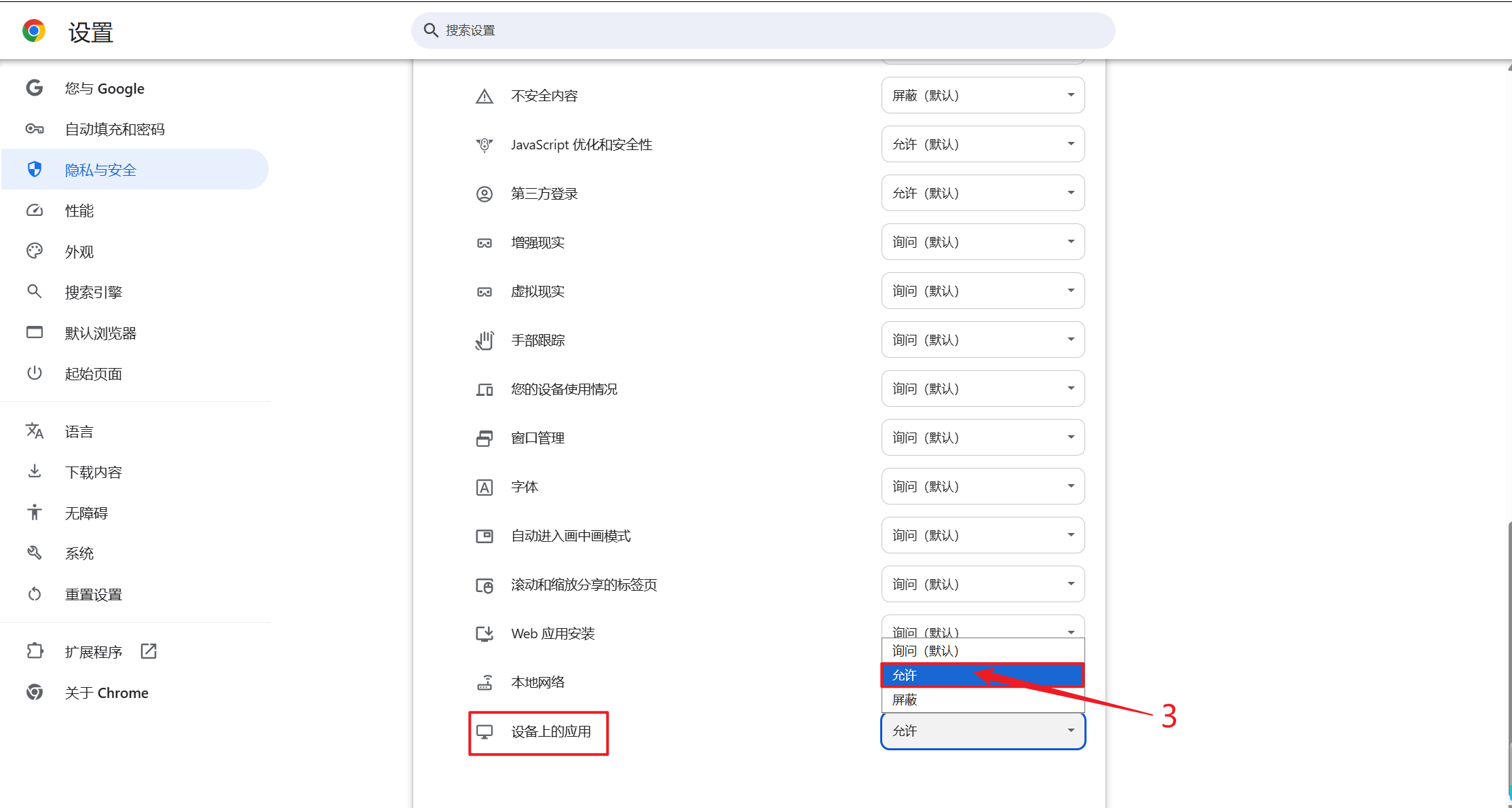 第二步:将设备上应用设置为“允许”