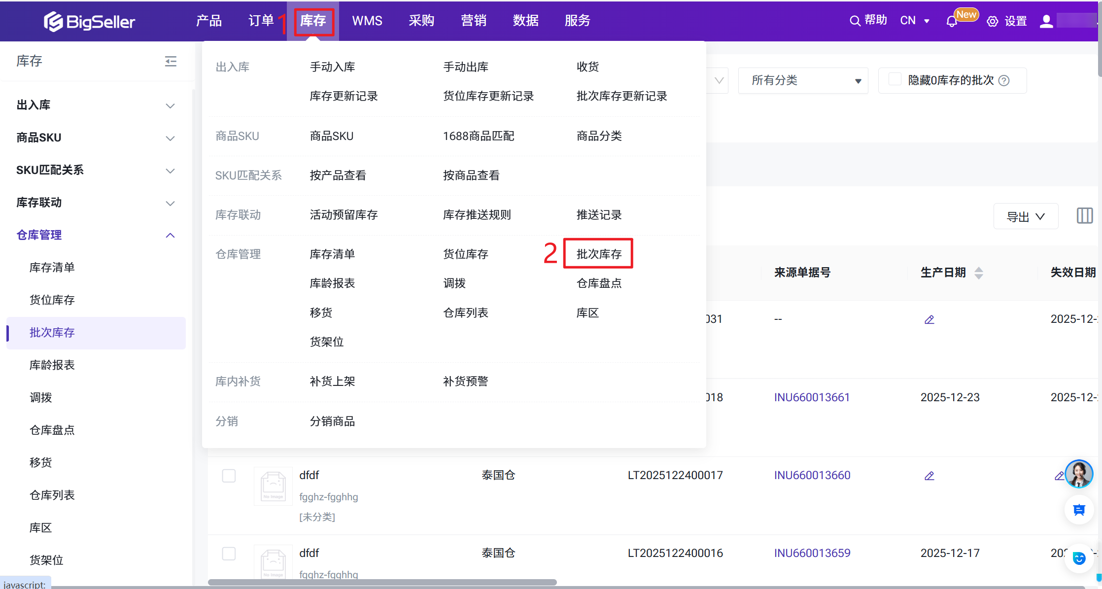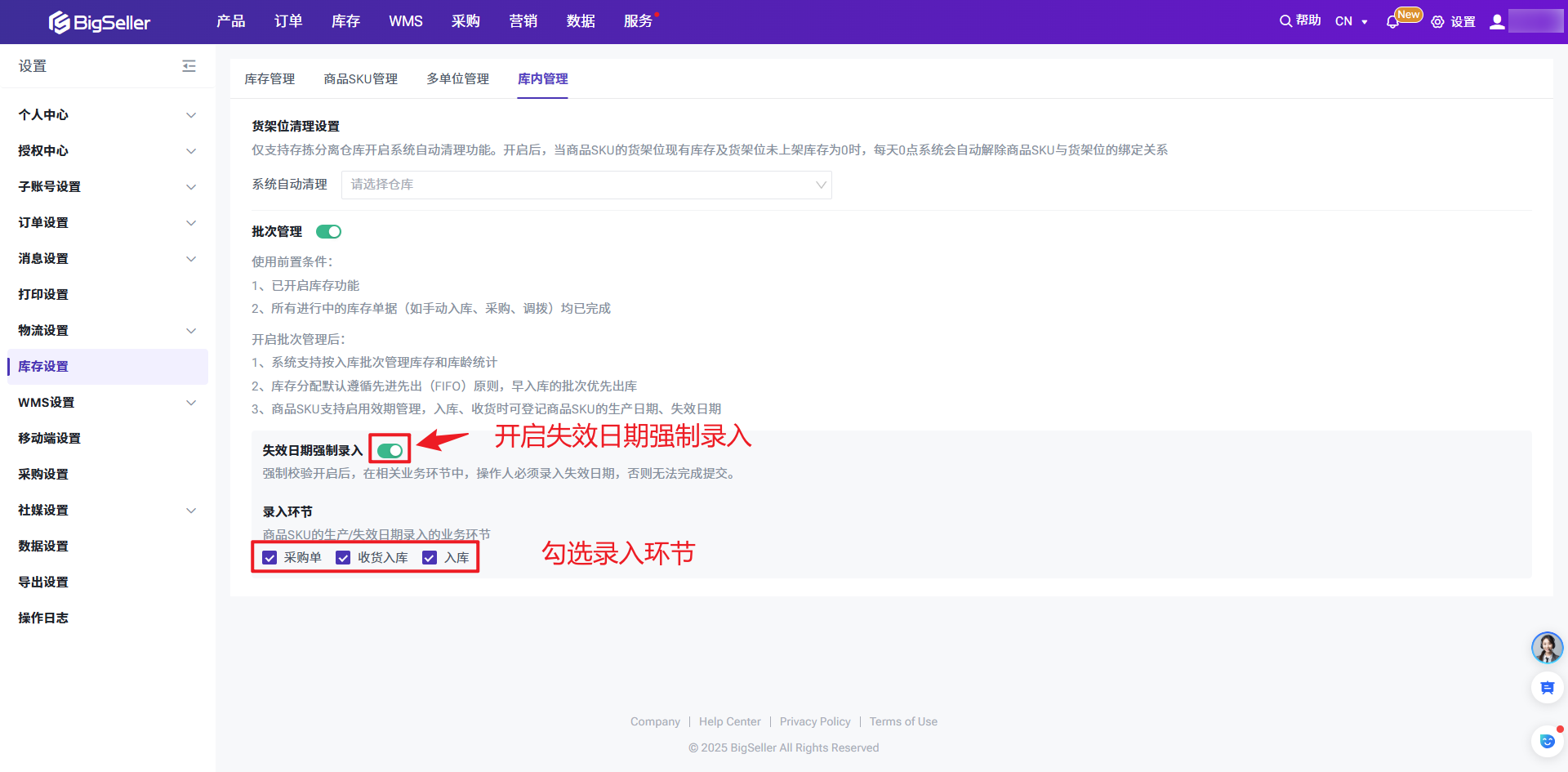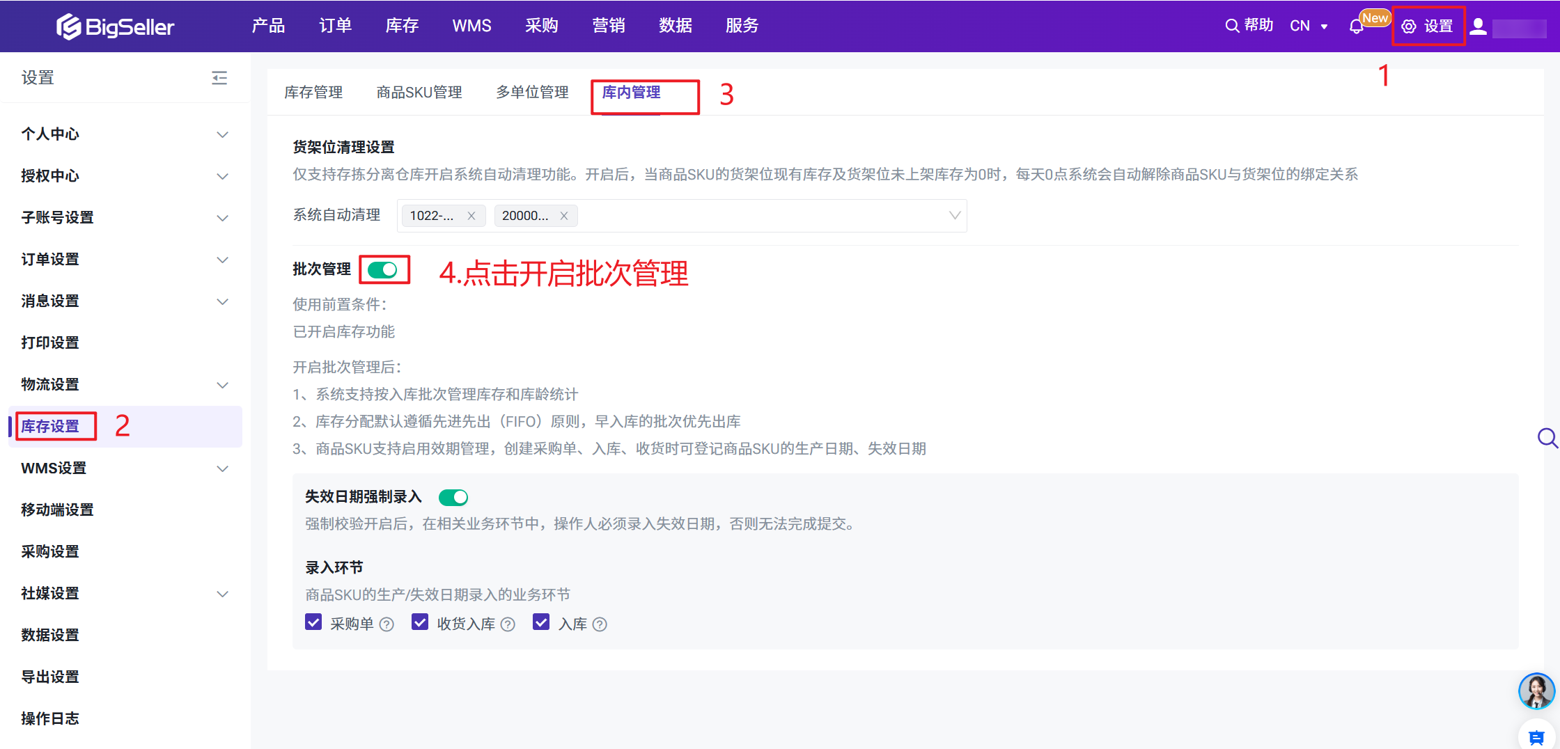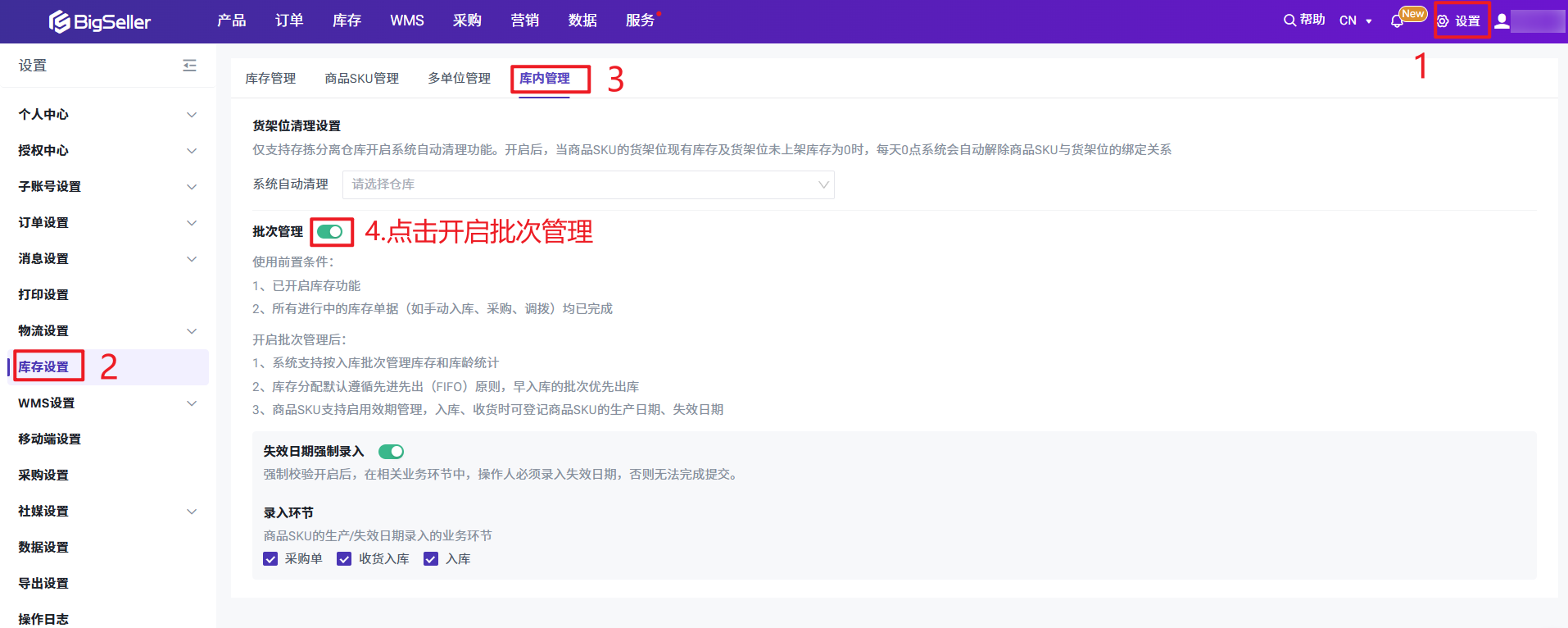 设置 > 库存设置 > 库内管理 > 点击开启批次管理开启之后: