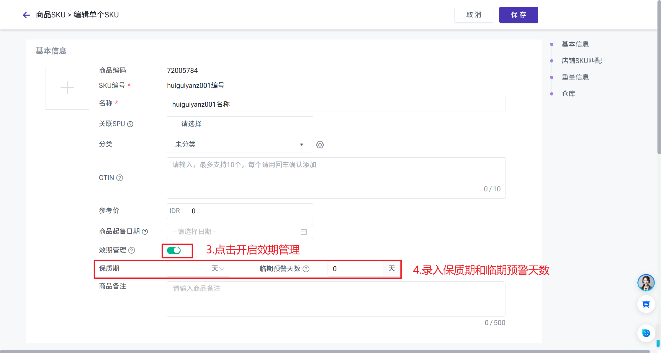 商品SKU > 编辑/新增商品SKU > 开启效期管理 > 设置保质期和临期预警