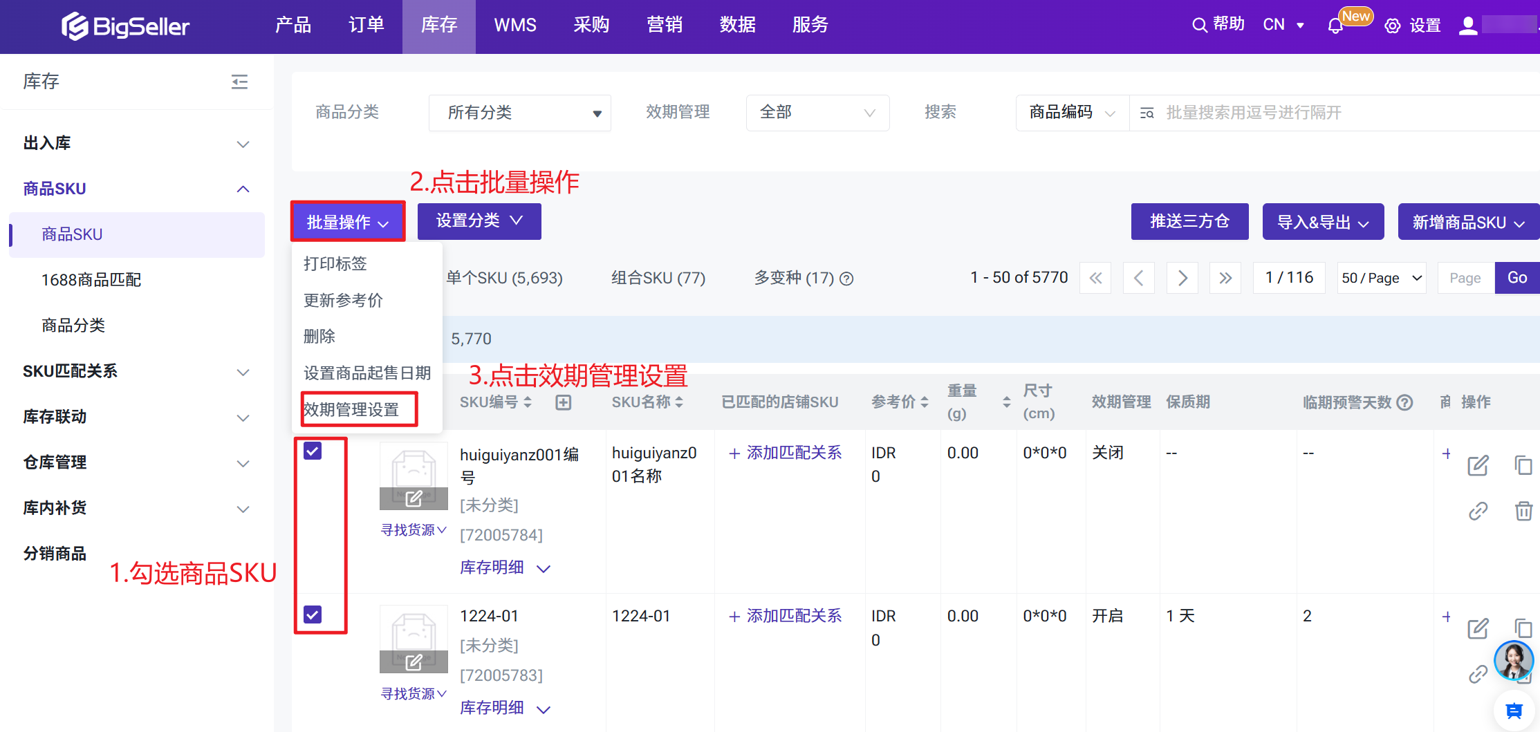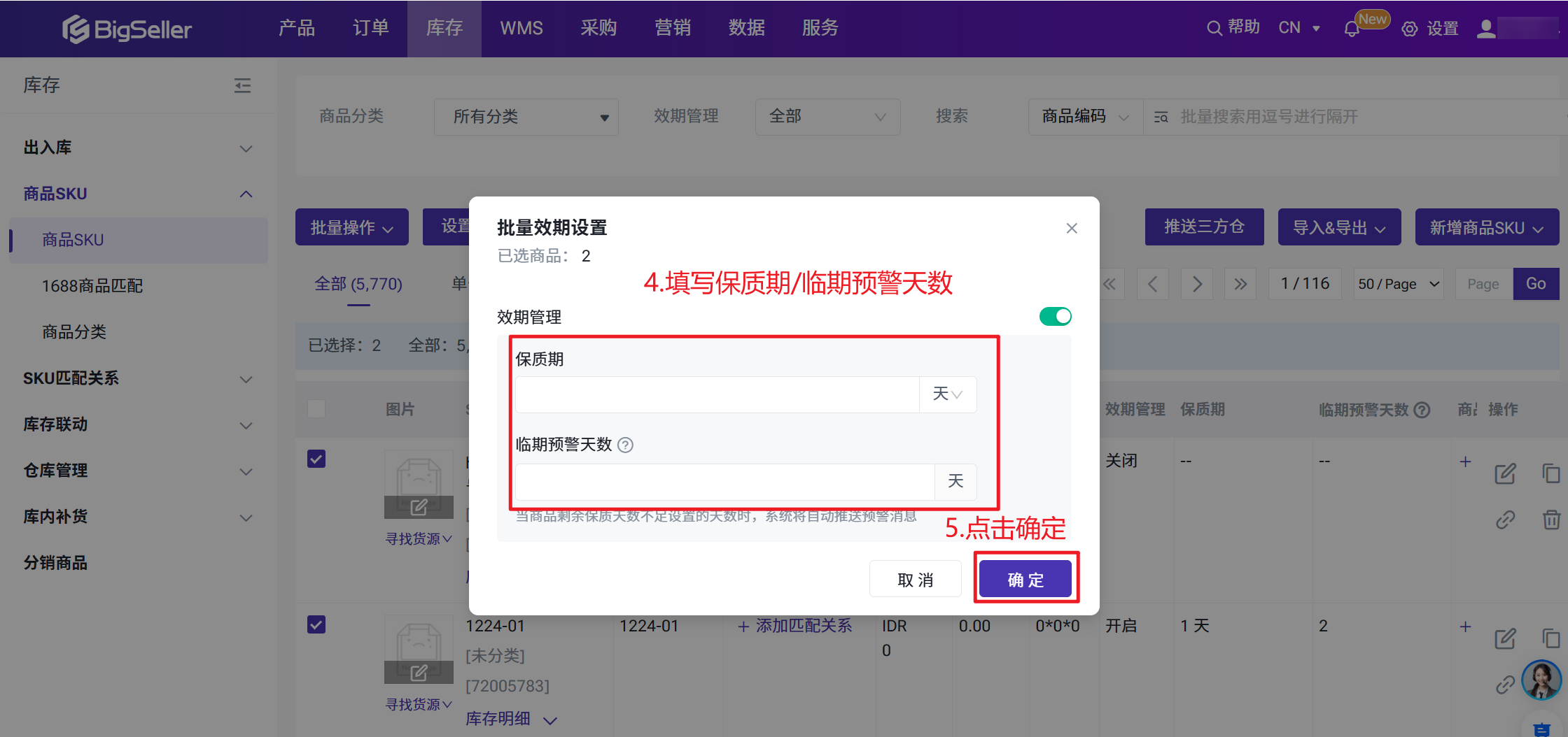 勾选商品SKU > 批量操作 > 效期管理设置 > 填写保质期/临期预警