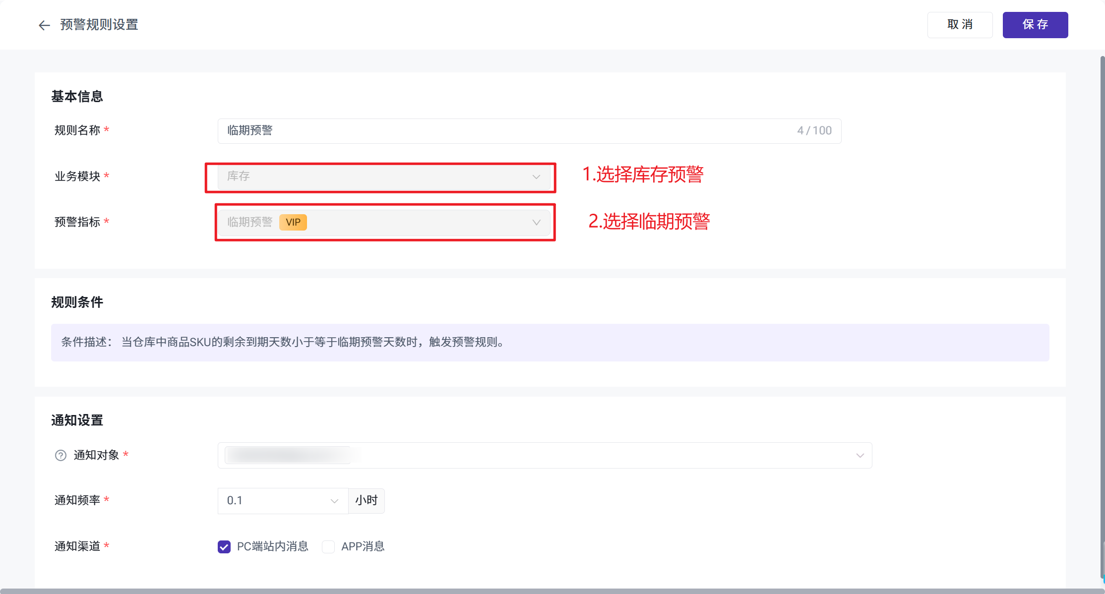 临期预警天数:保质期预警功能需在预警中心开启对应规则后方可生效。填写预警天数后,当商品剩余保质天数不足此天数时,系统将自动推送预警消息。
