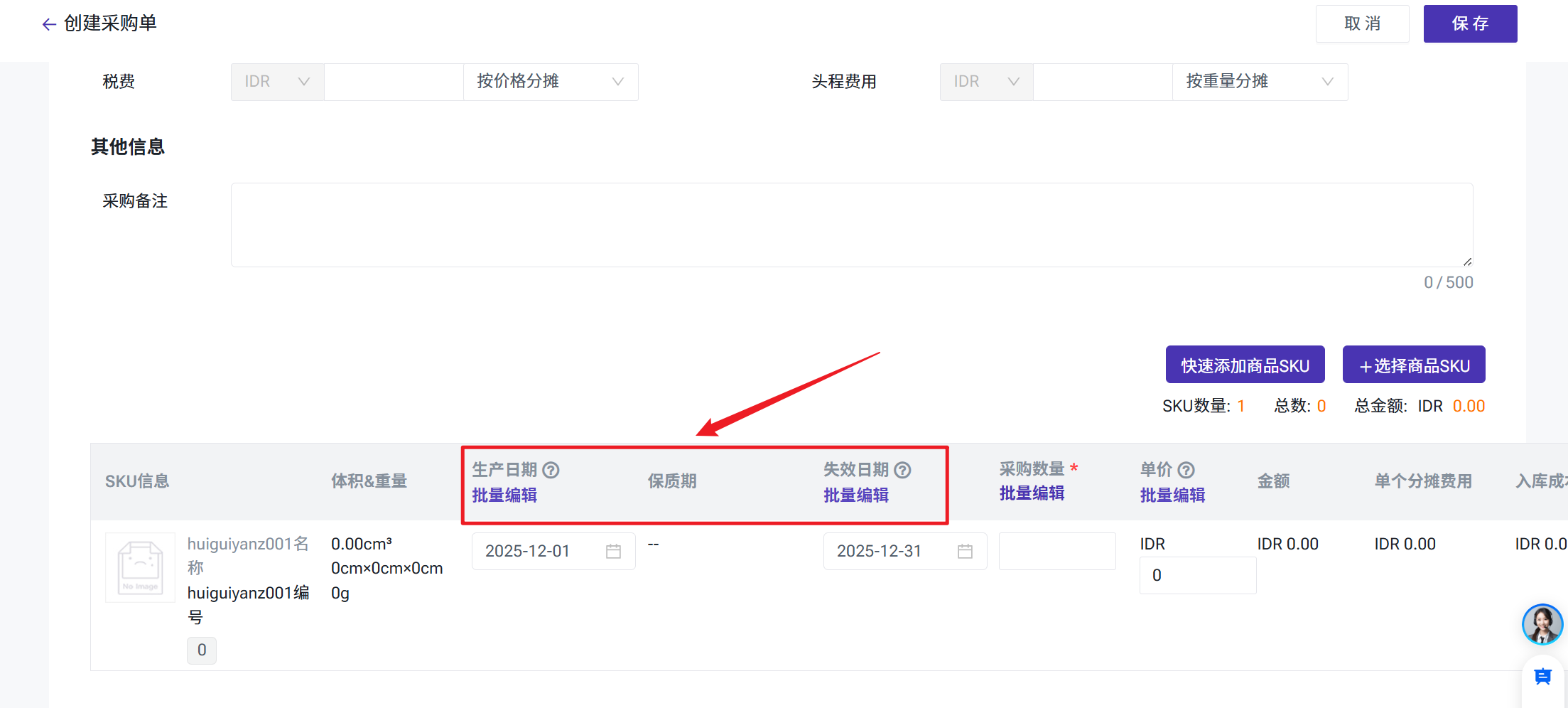 失效日期:若已设置失效日期强制录入,则已开启效期管理的商品SKU需填写失效日期