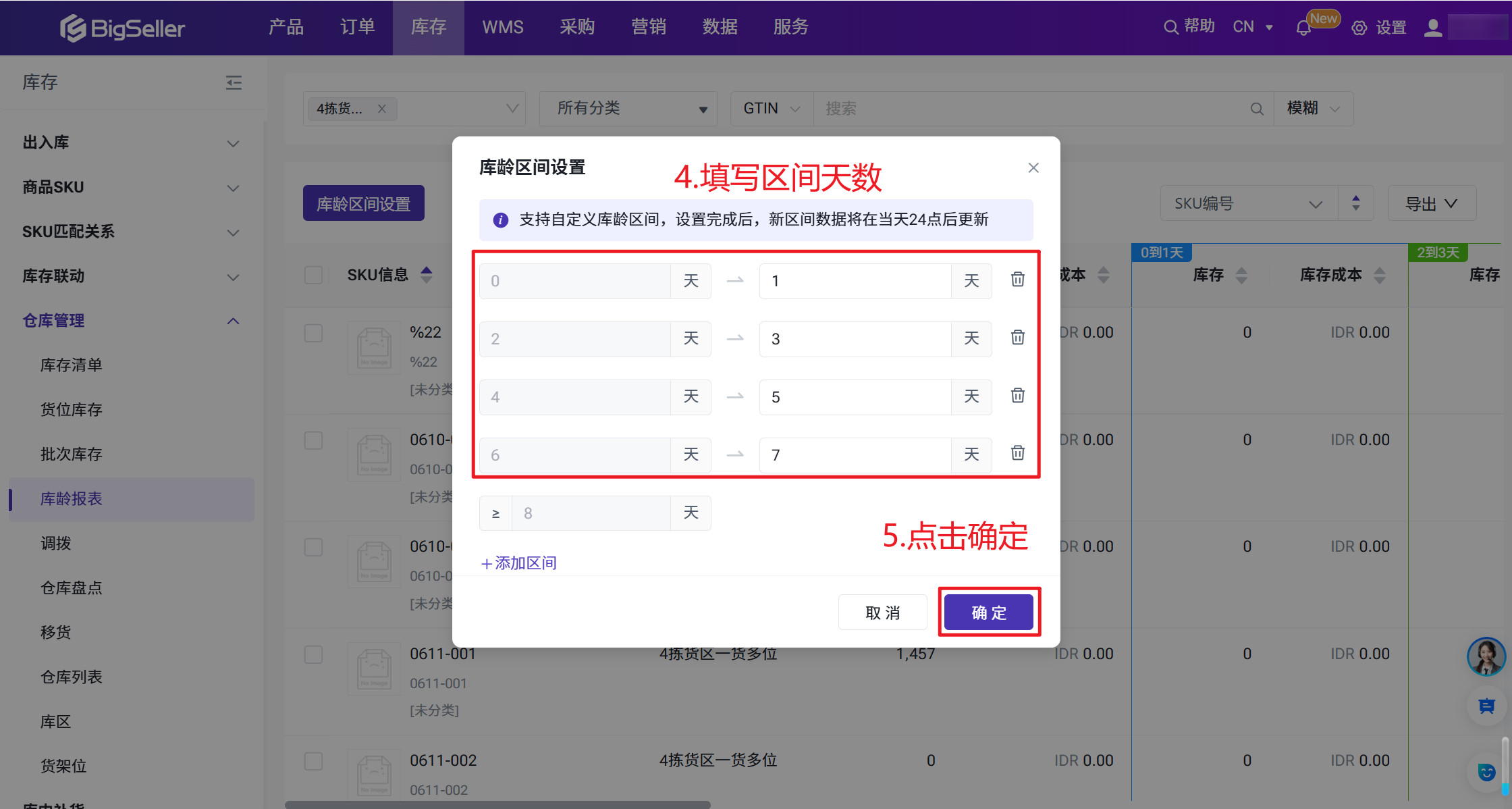 5、库龄区间支持用户自定义,例如:0-30,31-60,61-90,91天以上;