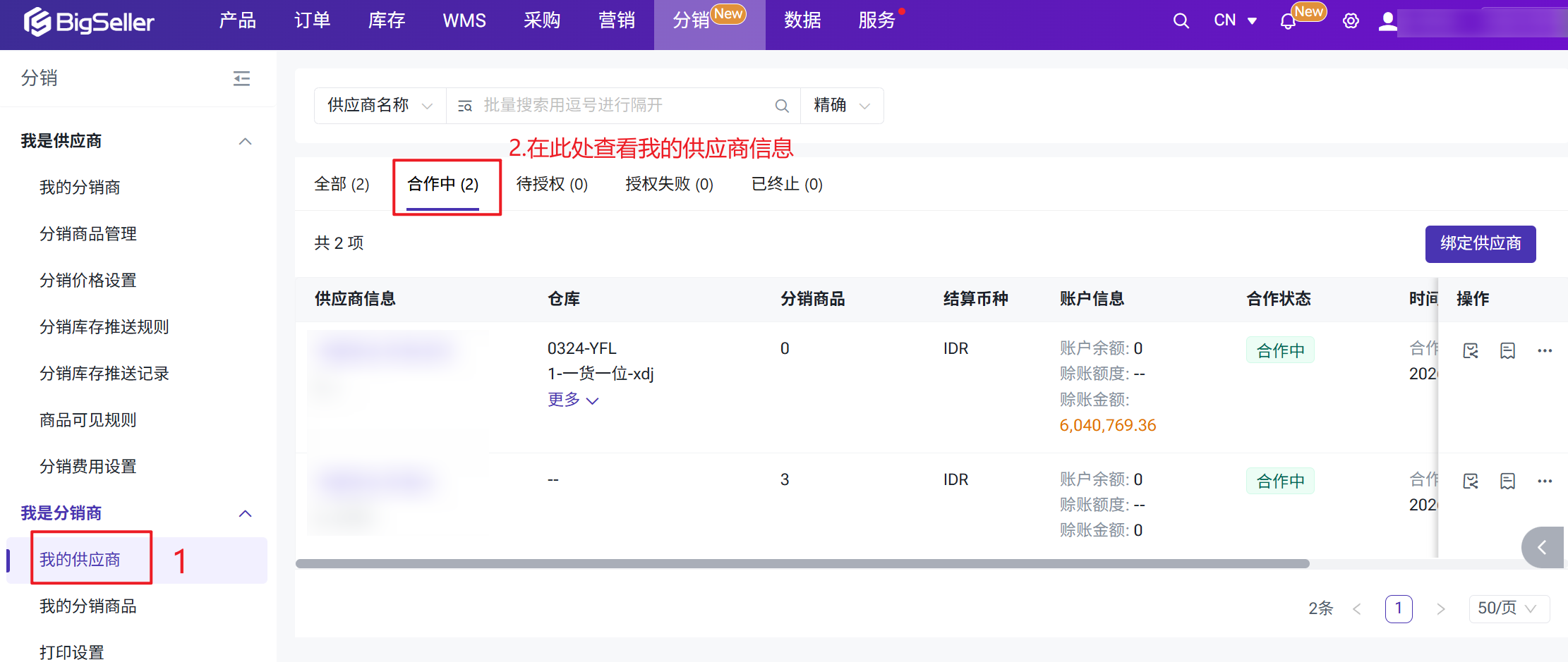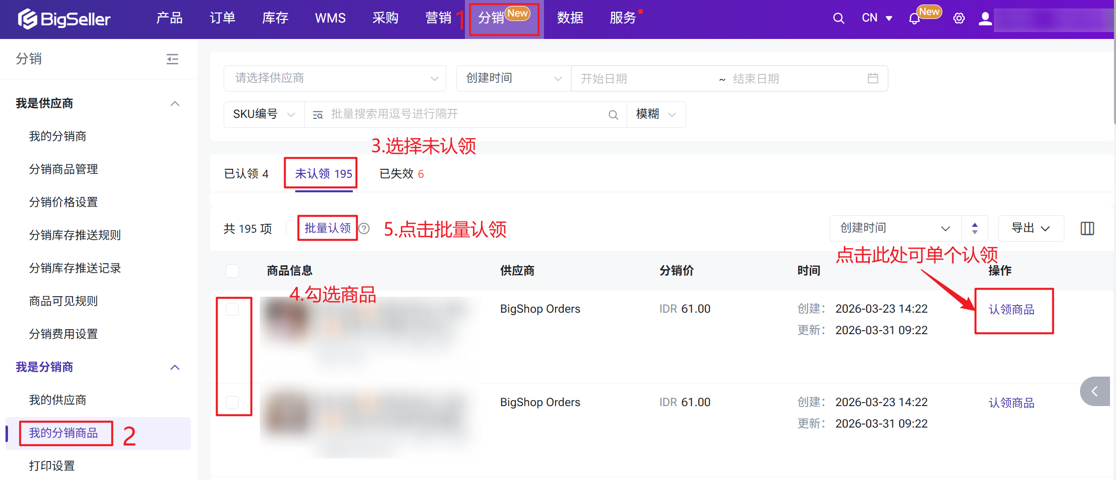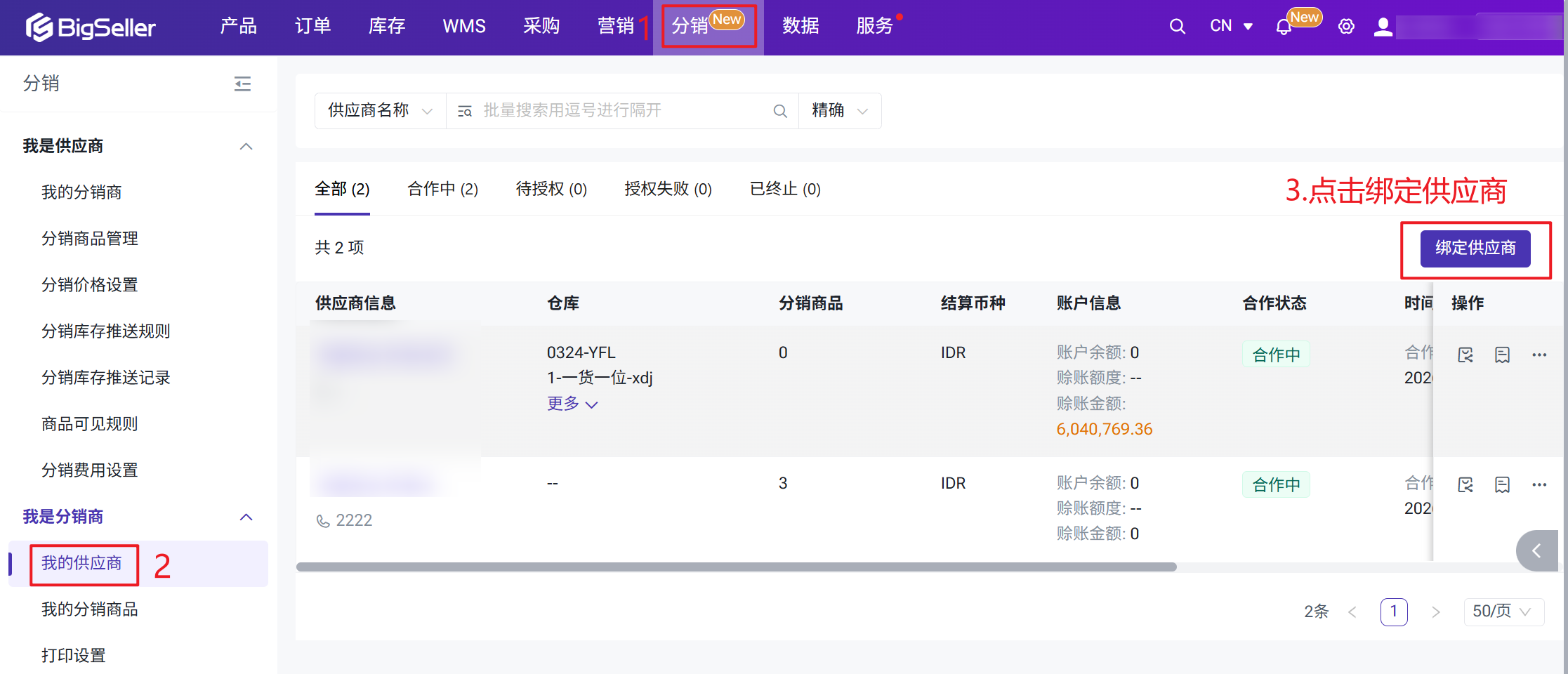 BigSeller分销功能帮助分销商(二级代理、批发商、独立卖家)通过系统与供应商建立合作关系,一键认领商品、同步平台订单并推送给供应商代发,同时自动完成费用核算与对账结算——彻底告别手动截图发货、线下对账的混乱局面。二、注意事项