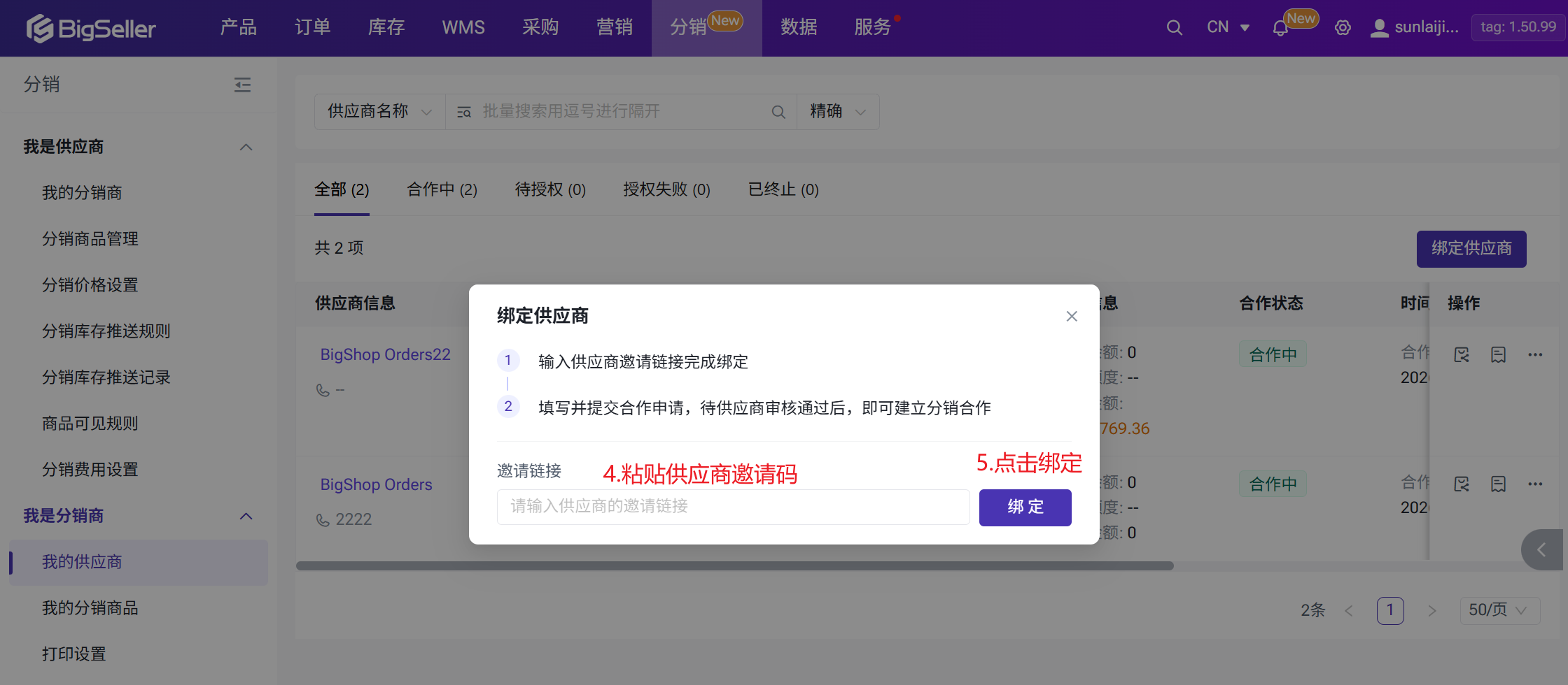 联系目标供应商,请对方在其BigSeller系统中生成【邀请分销商】链接,并发送链接给您