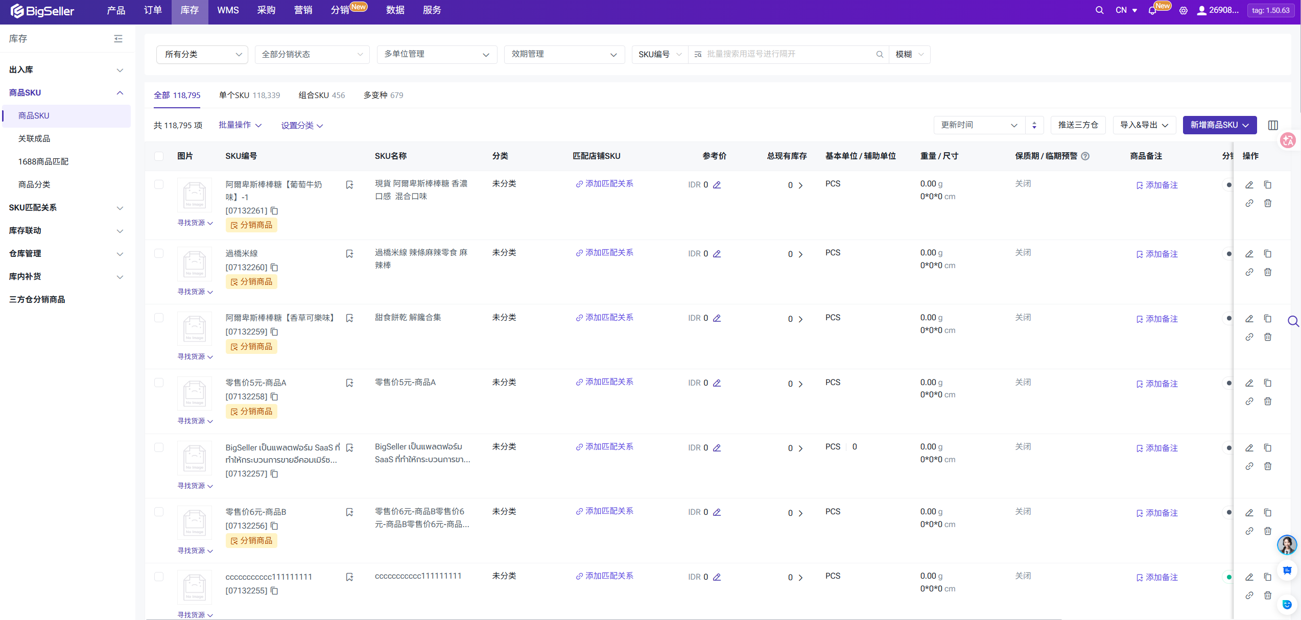 ⚠库存清单支持展示供应商仓库类型的仓库,展示分销商已认领的分销商品在各分销仓库中库存情况,自有仓库内作业功能、三方仓同步库存功能对分销仓库禁用。供应商仓库类型为虚拟仓库,所以仅支持分销商查看库存,不支持操作库内作业(上架、下架、疑惑、补货、货位调整等)、采购(供应商类型仓库的商品SKU不触发采购建议的计算)等功能。