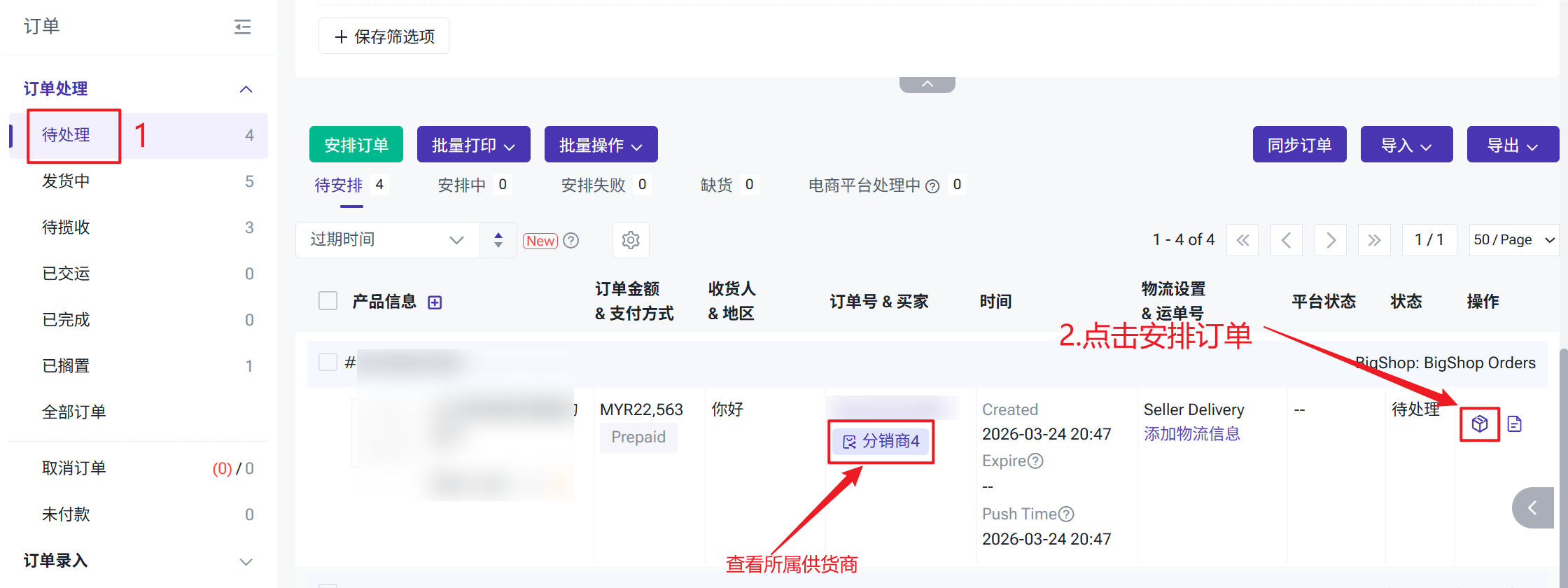 买家在 Shopee / Lazada / TikTok Shop 等平台下单后,BigSeller会自动同步订单。分销商品的订单需要手动安排或自动安排后推送给供应商,由供应商完成拣货、打单和发货。订单状态说明