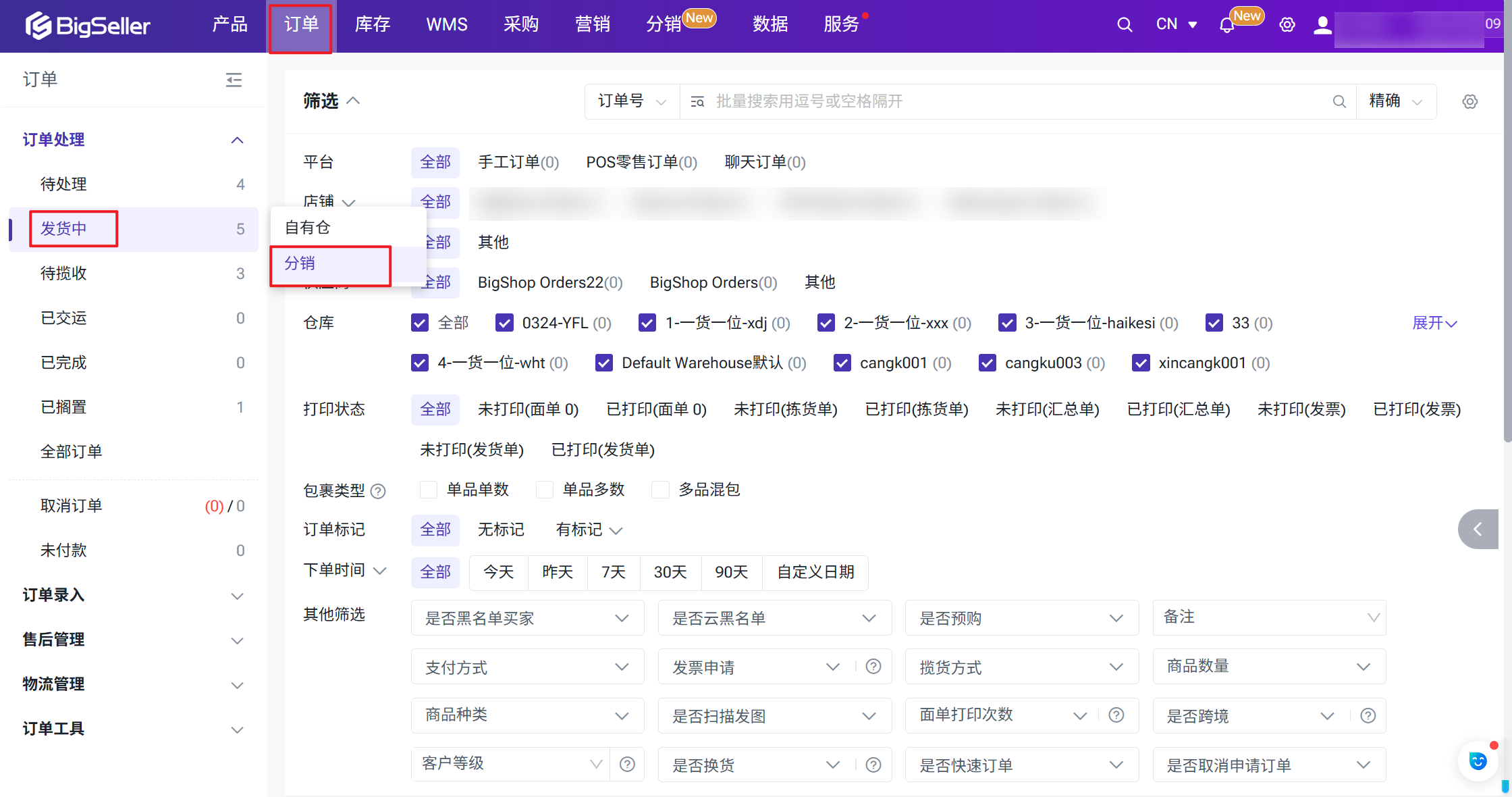 当订单安排成功之后,订单将会进入待打单/发货中【分销】页面