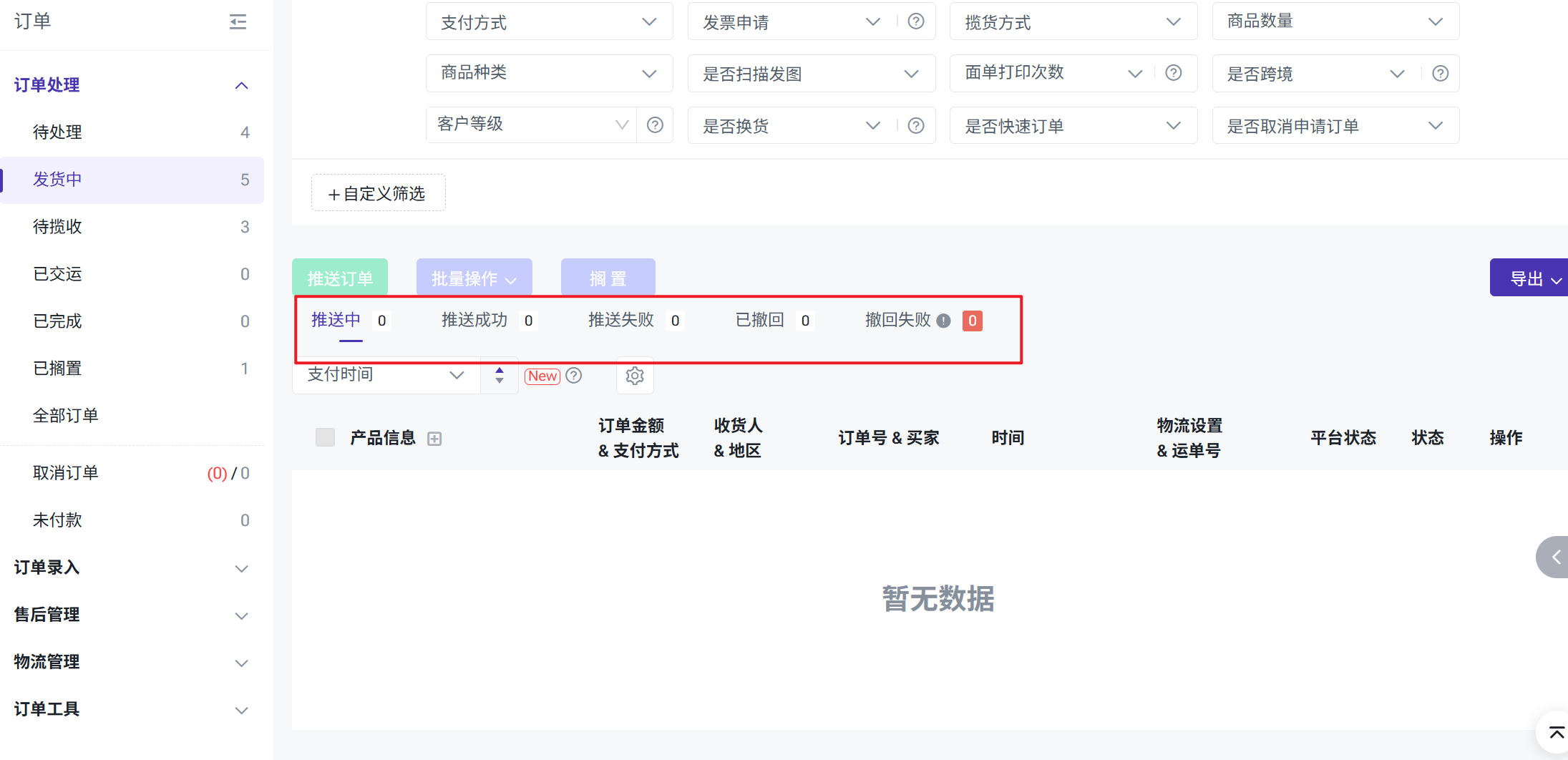 | 推送失败 | 获取面单/运单号失败 | 没有获取到面单/运单号 |