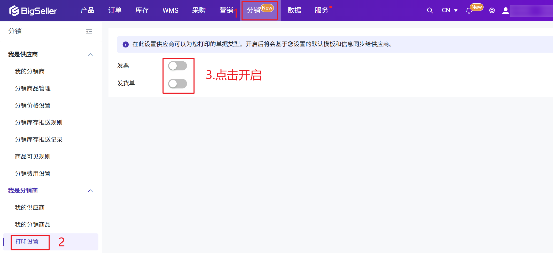 在此设置供应商可以为您打印的单据类型。开启后将会基于您设置的默认模板和信息同步给供应商。分销 > 打印设置 > 开启发票/发货单