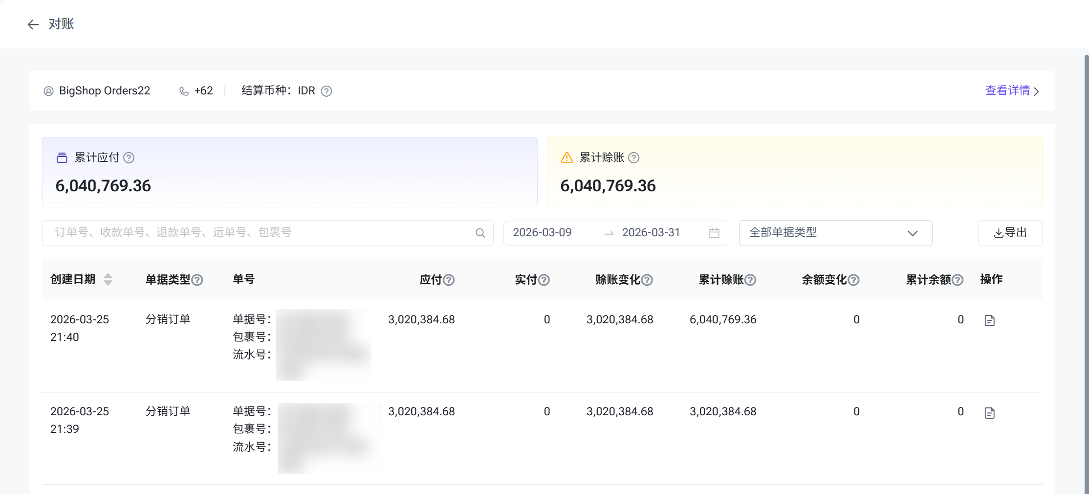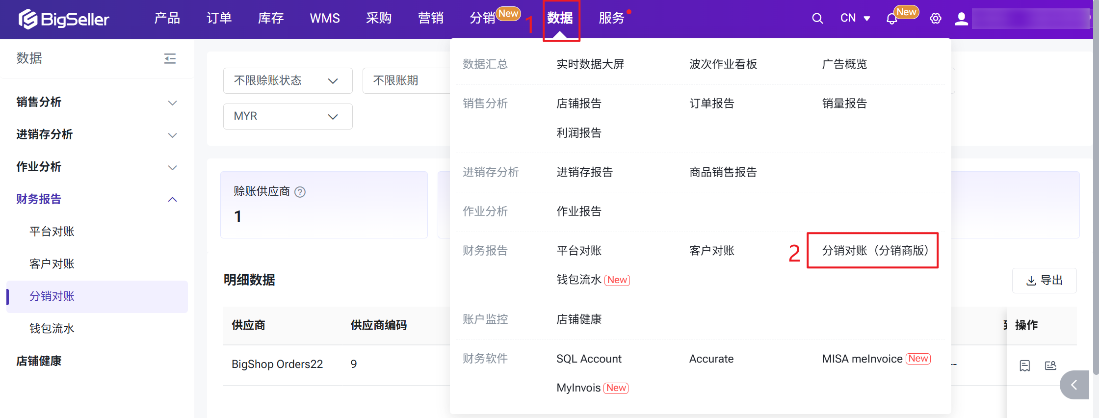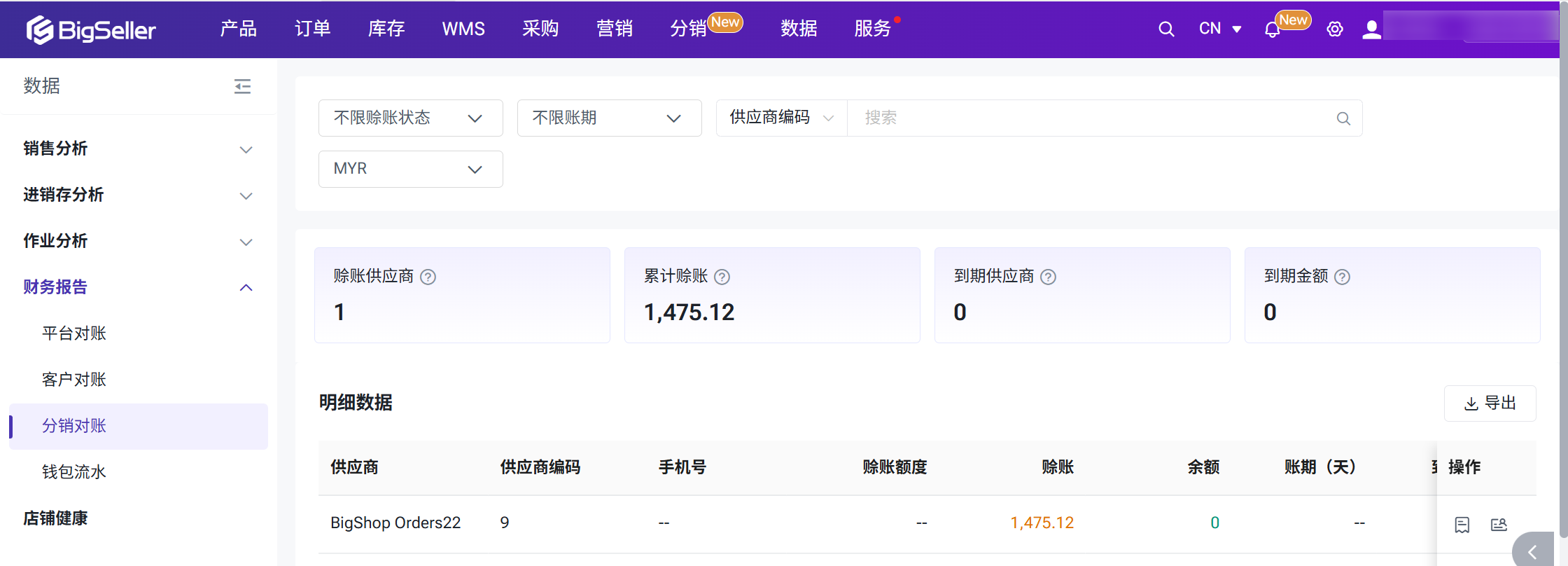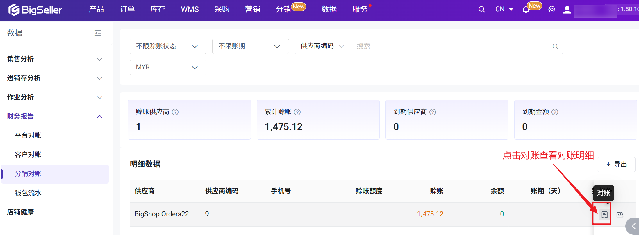 分销商可随时在BigSeller中查看与每个供应商之间的费用明细、账户余额和赊账情况。进入数据 > 分销对账页面